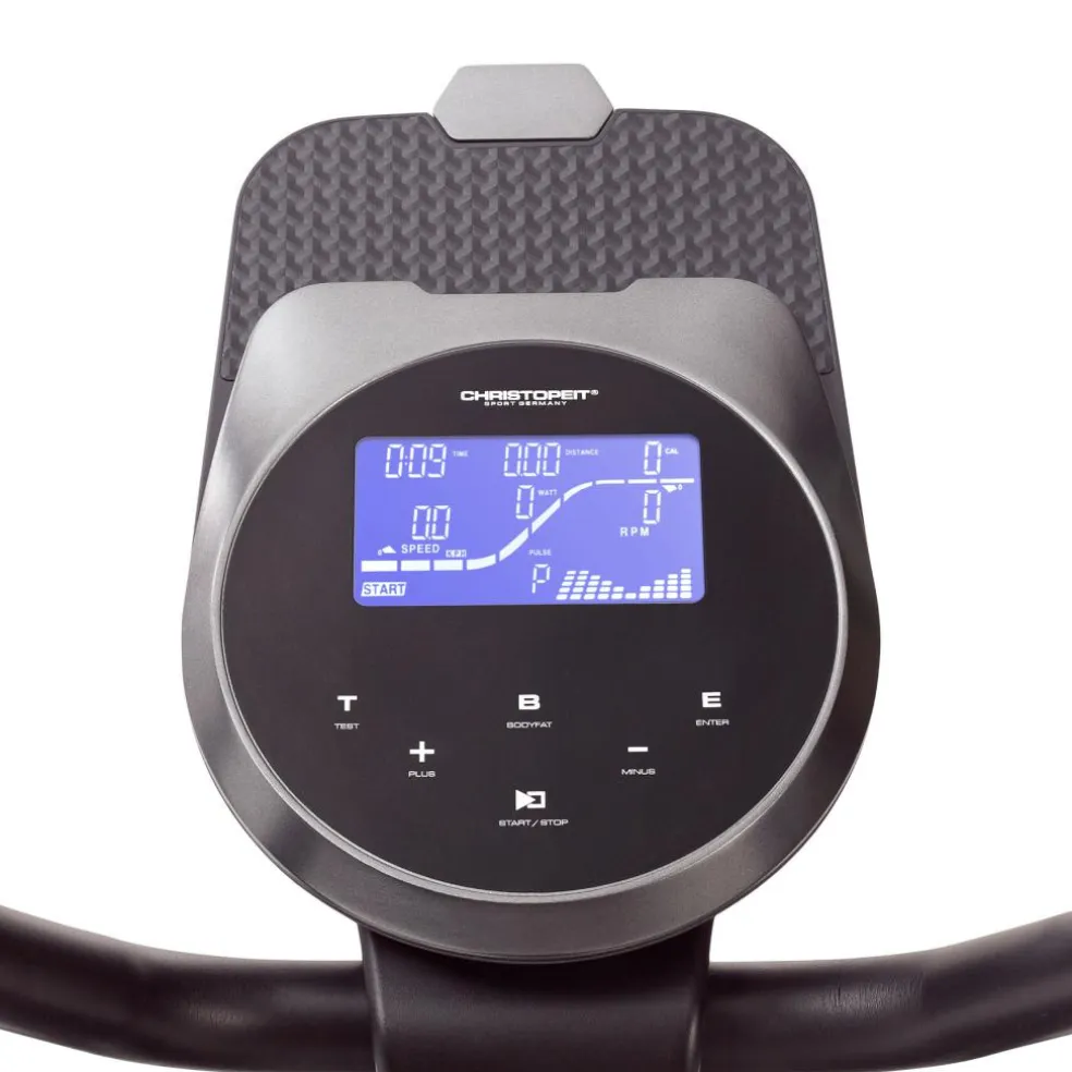 Den brugervenlige computer med et baggrundsbelyst LCD-display viser dig alle vigtige værdier såsom tid, distance, hastighed, kalorieforbrug, puls, RPM, watt og ODO på et øjeblik. Den intuitive betjening giver mulighed for nem navigation gennem de forskellige programmer, herunder 12 forudindstillede træningsprogrammer og 5 pulsbaserede programmer til tilpasset træning.
