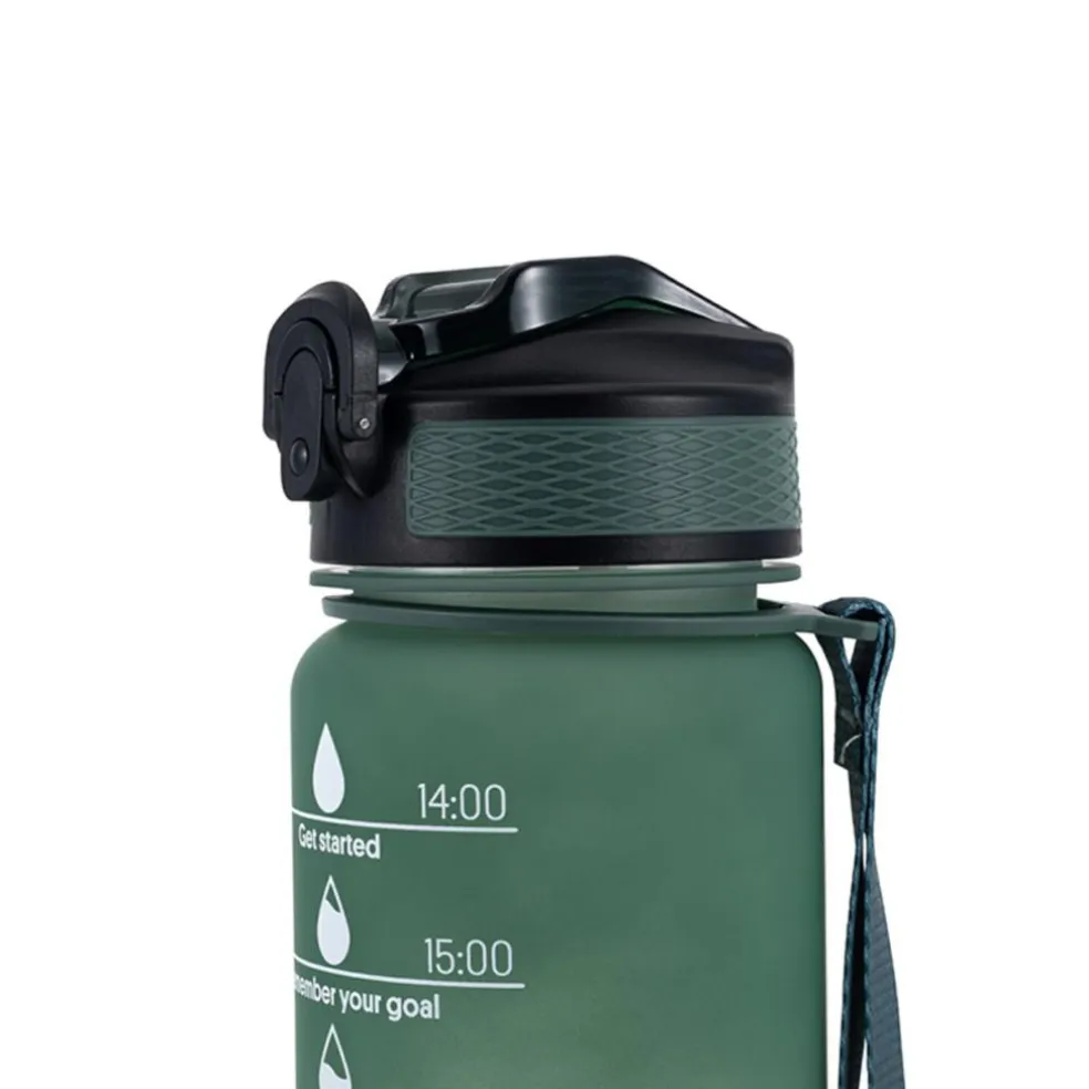 Motivationsflasken er udstyret med sugerør og en flip-lock mekanisme, der effektivt forhindrer lækager, og den leveres med en praktisk bærestrop.
