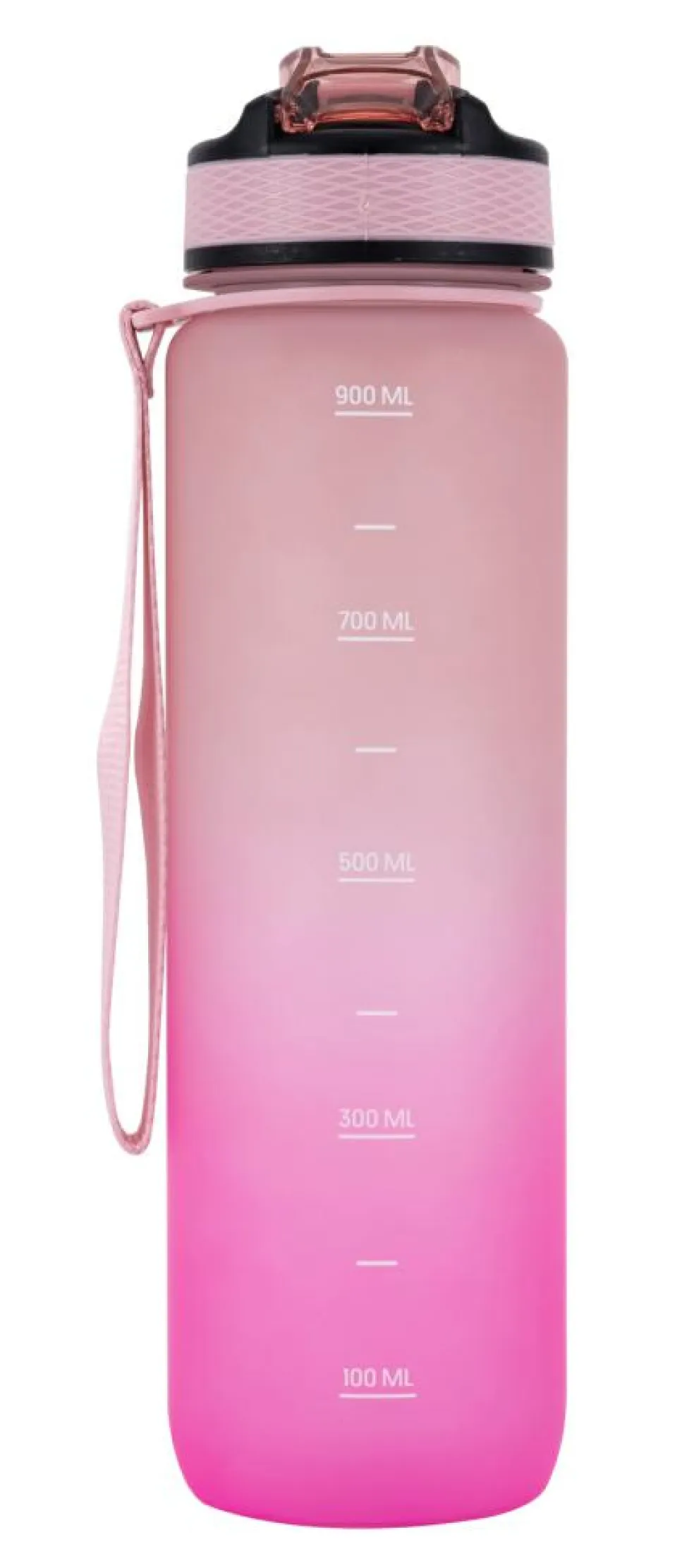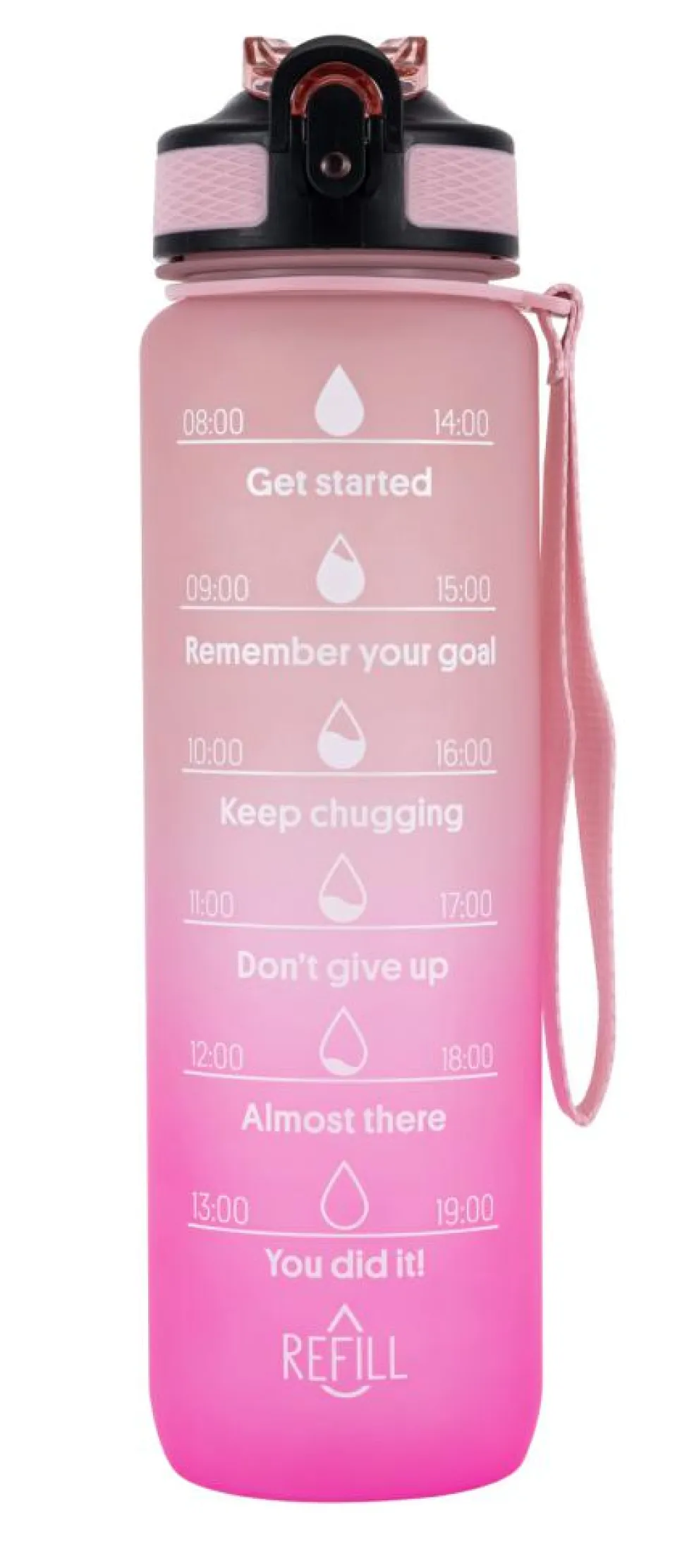 Flasken har et motiverende design og en smart tidsmarkør, der viser, hvor meget vand du har drukket og hvor meget der er tilbage, indtil du har nået dit mål for dagen. På den øverste målelinje på flasken er der angivet 900 ml, men der er lidt ekstra plads, så når flasken er helt fyldt kan den rumme ca 1 liter.