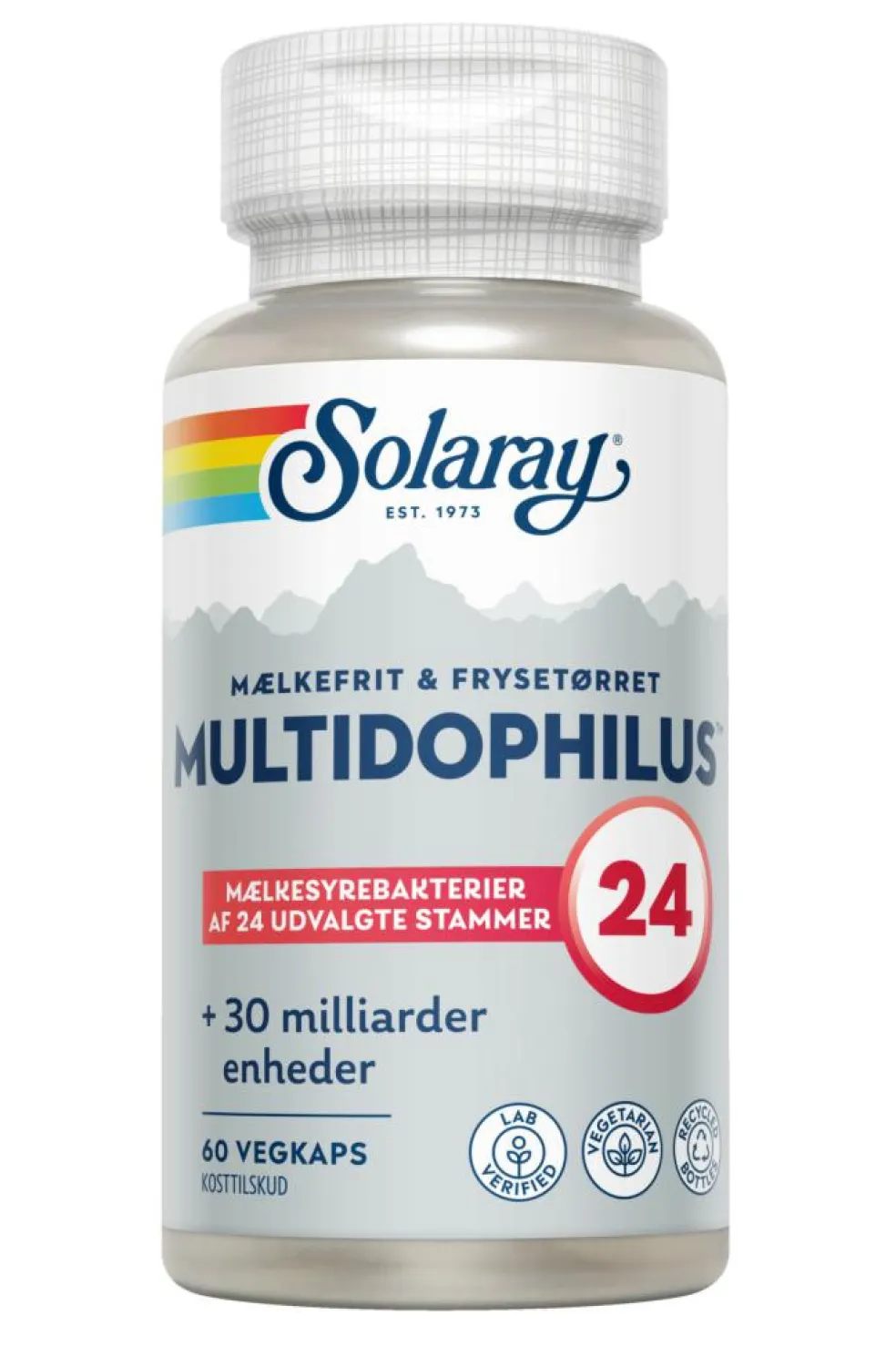 Hver kapsel indeholder 24 udvalgte stammer af mælkesyrebakterier, 2 kapsler giver tilsammen 30 milliarder levende bakterier*.