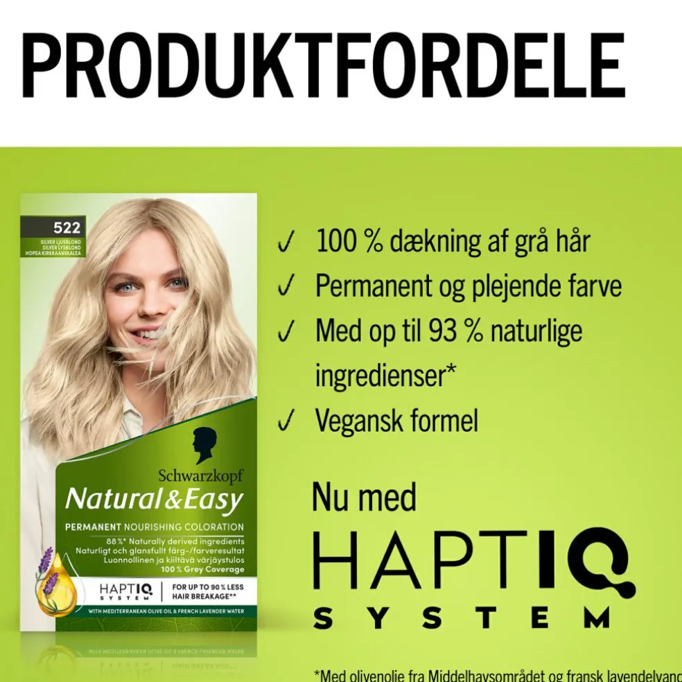 Hårfarven giver 100% dækning af grå hår, så det er nemt at dække. Hårfarven er også vegansk og fri for animaliske ingredienser, med op til 93%* ingredienser af naturlig oprindelse, der fremhæver en naturlig hårfarve. Vil du også have en plejende hårfarve? Den medfølgende balsam med olivenolie fra Middelhavet indeholder 97%* ingredienser af naturlig oprindelse, hvilket giver dig et smukt og skinnende hår.