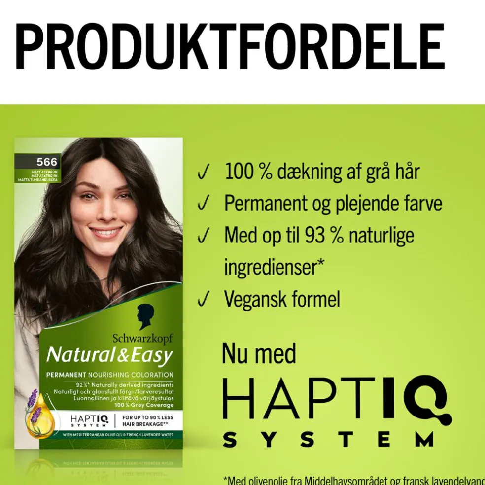 Hårfarven giver 100% dækning af grå hår, så de er nemme at dække. Hårfarven er også vegansk og fri for animaliske ingredienser, med op til 93%* ingredienser af naturlig oprindelse, der fremhæver en naturlig hårfarve. Vil du også have en plejende hårfarve? Den medfølgende balsam med olivenolie fra Middelhavet indeholder 97%* ingredienser af naturlig oprindelse, hvilket giver dig et smukt og skinnende hår.