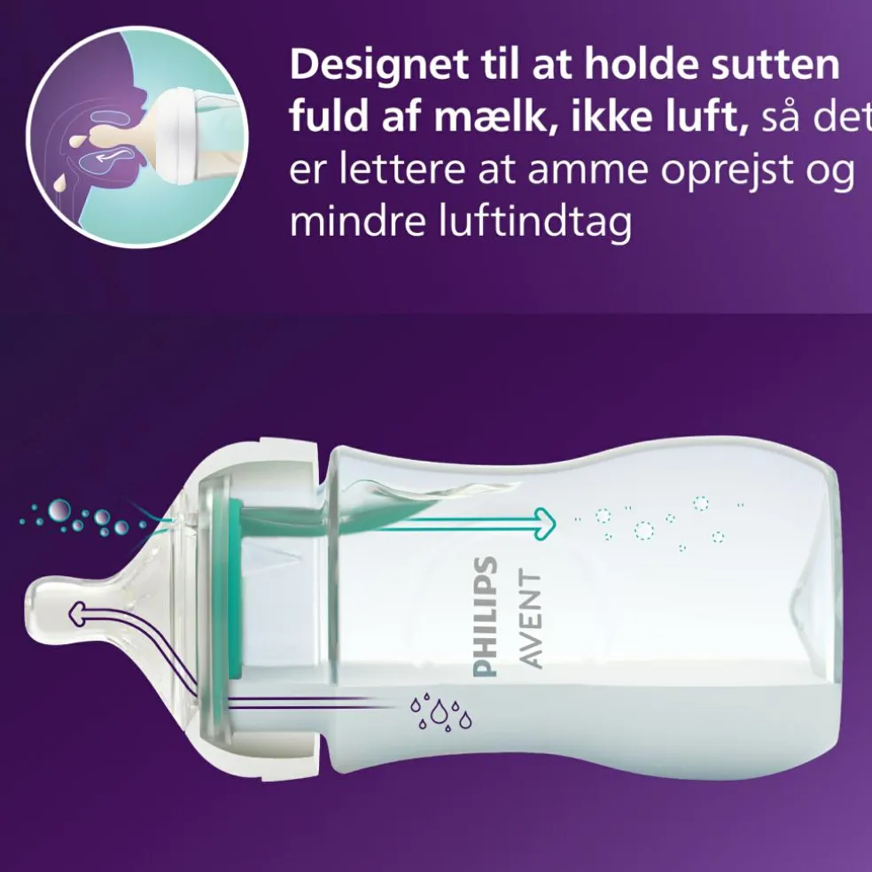 Suttens åbning er designet til kun at frigive mælk, når babyen sutter. Så du kan trygt undgå spild af mælk, uanset om du er hjemme eller på farten.