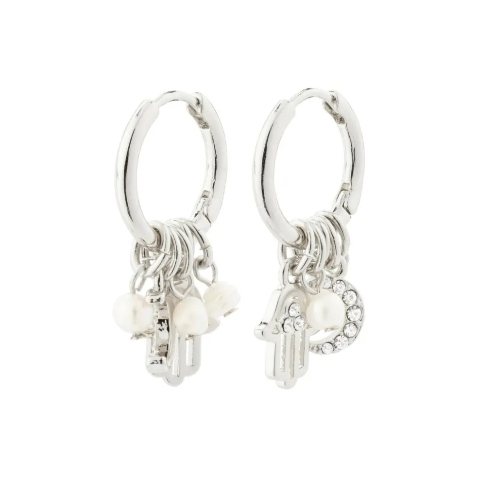 Be you. Do you. For you! Giv hverdagen et strejf af romantik og eventyr med de sølvbelagte PRUCENCE øreringe fra Pilgrim. Charmerende hoops med tiny charms, som indfanger drømme og beskyttelse gennem symbolerne månen og Hamsa. Små ferskvandsperler og skinnende Preciosa-krystaller tilfører en magisk glød. Creolerne har en letanvendelig kliklås og er fremstillet af 85% genanvendt materiale med omtanke for miljøet.