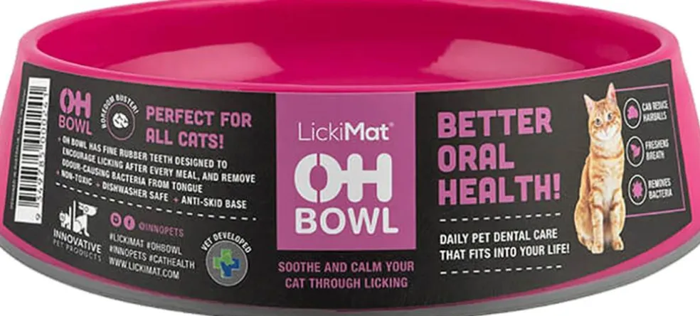 OH-skålen til katte er en kattefoderskål med bonussen af en daglig kæledyrstandpleje, der nemt passer ind i en kæledyrsejers liv. Med sine fine gummitænder designet til at opmuntre til slikning efter hvert måltid ved at fange madpartikler, skal enhver pels på tungen løftes og fanges på skålens tænder, før katten kan indtage det.