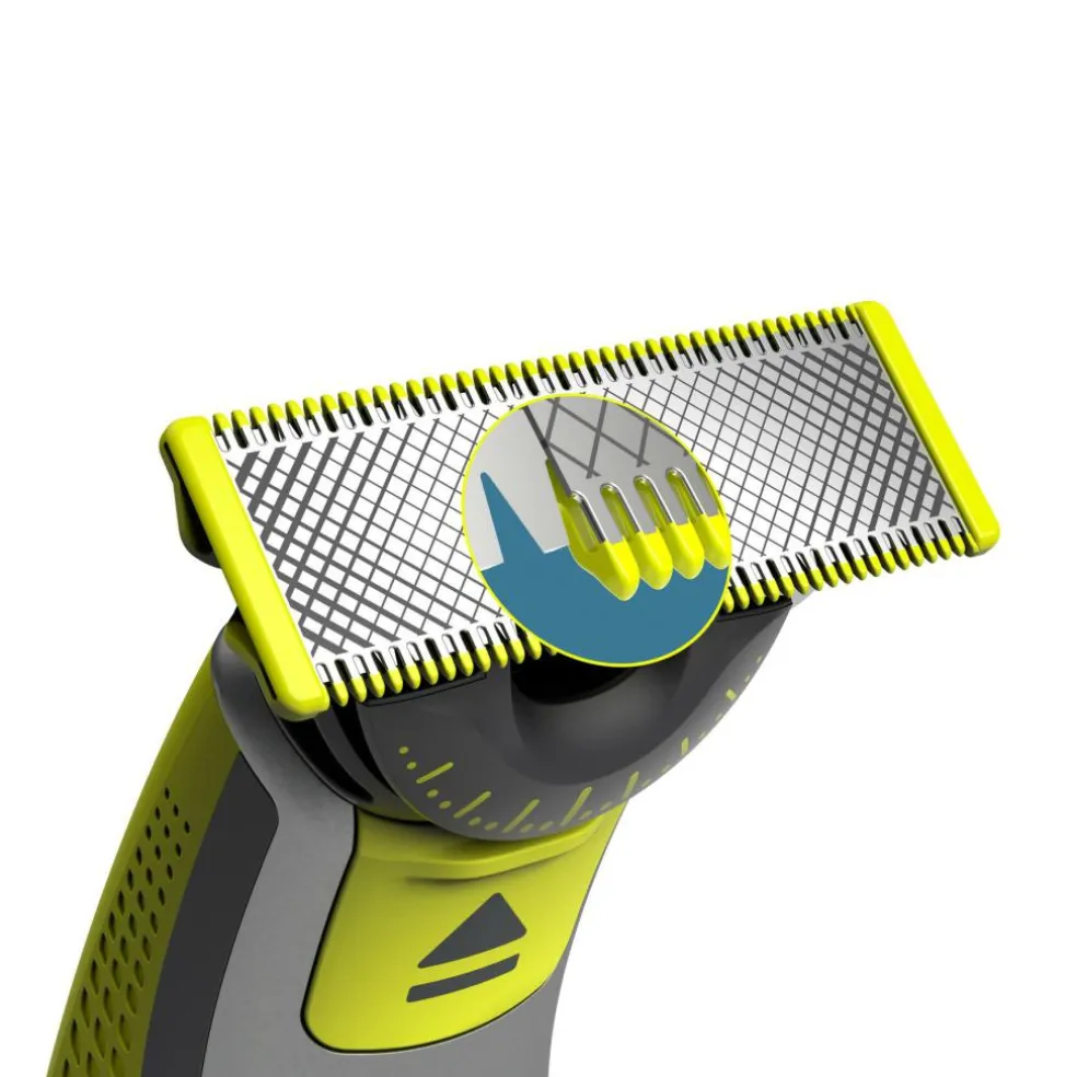 Philips OneBlade er en revolutionerende ny hybridstyler, der kan trimme, barbere og skabe rene linjer og kanter på alle hårlængder. Det dobbelte beskyttelsessystem – en glidebelægning kombineret med afrundede spidser – gør barberingen nemmere. OneBlade-barberteknologien har en hurtigt bevægelig trimmer, der skærer gennem alle hårlængder.