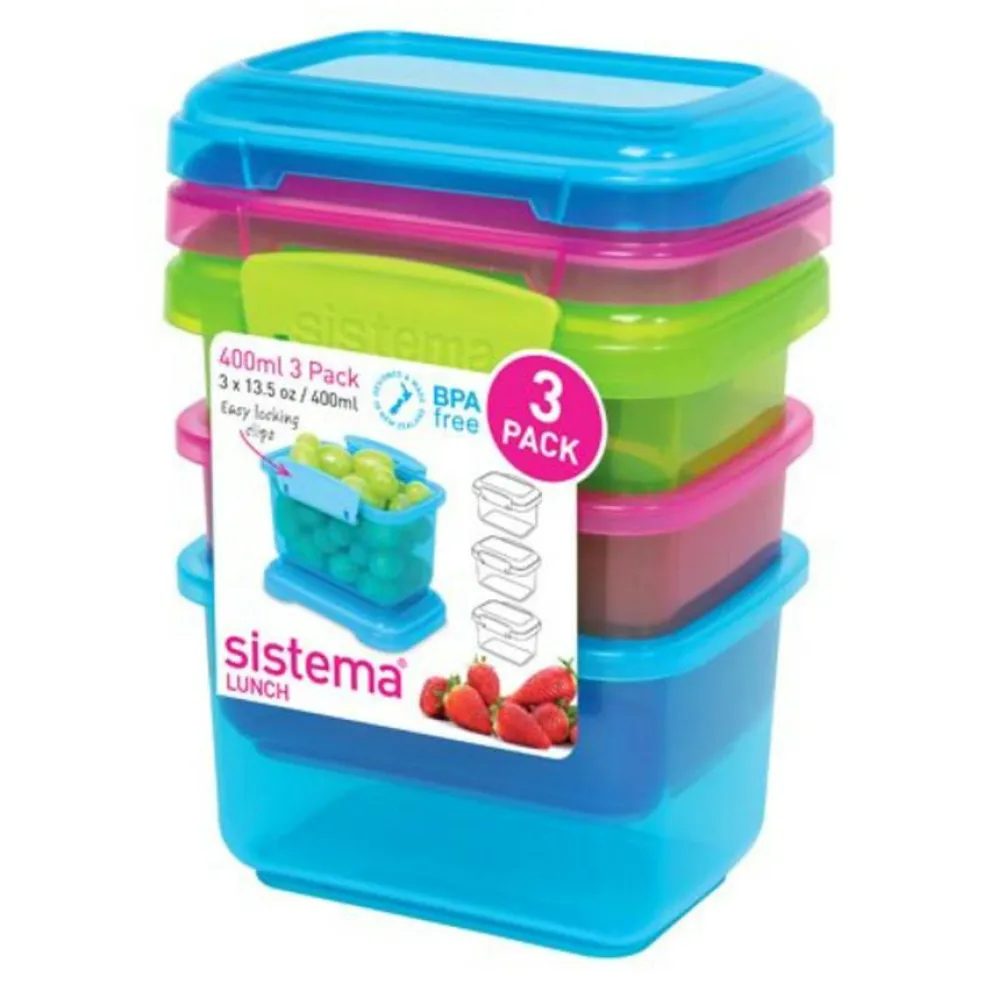 Pakke med 3 mindre bøtter i friske farver til opbevaring af rester efter aftensmaden, eller til frugt, snack, yoghurt eller lign. til madpakken. Indeholder 400 ml.