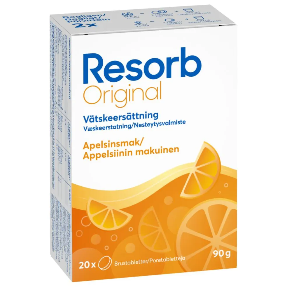 Resorb® Original brusetabletter findes i smagsvarianterne Appelsin, Hindbær, Skovbær og Mango.