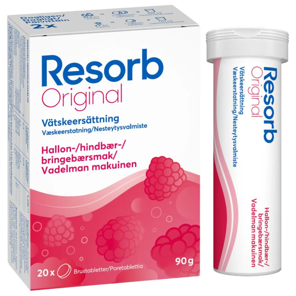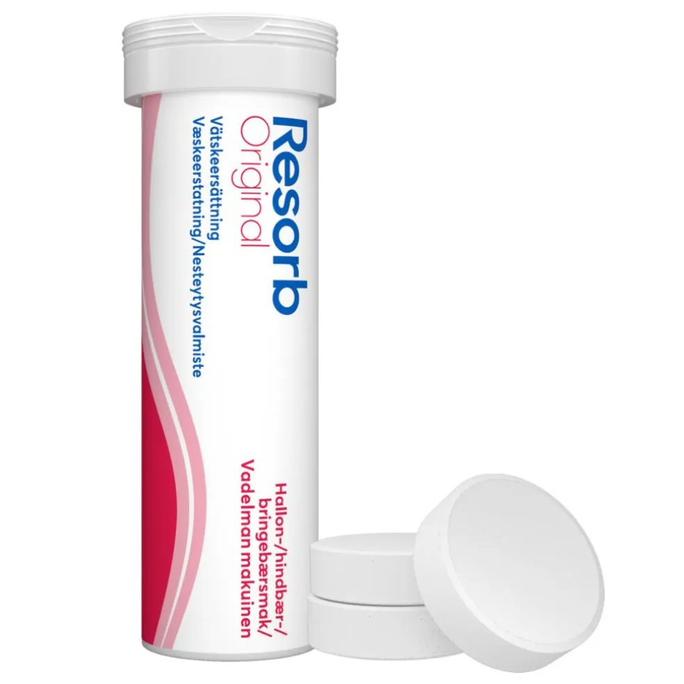 Resorb® Original brusetabletter findes i smagsvarianterne Appelsin, Hindbær, Skovbær og Mango.