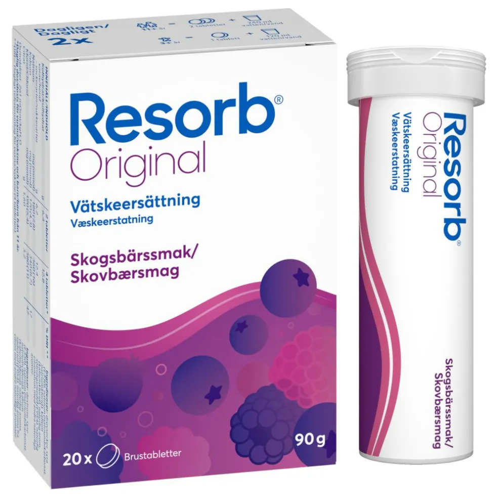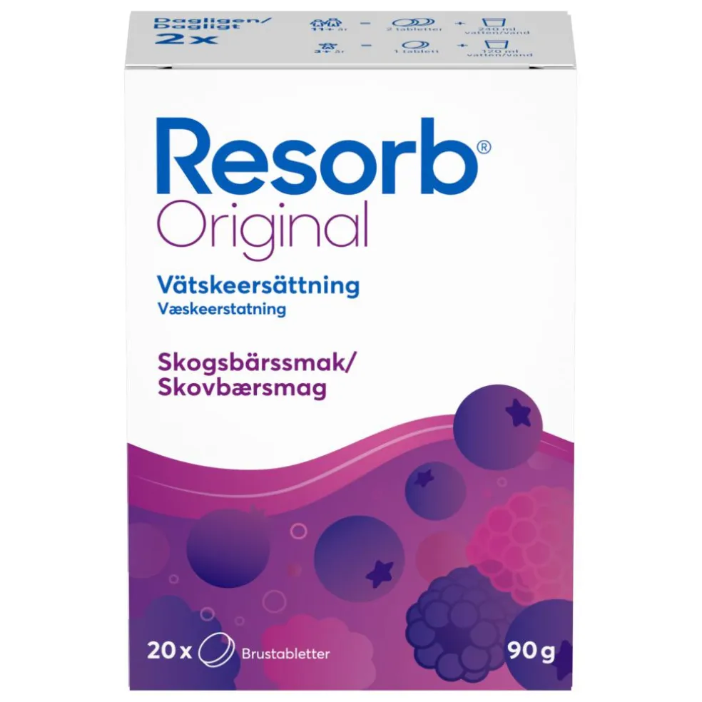 Resorb® Original brusetabletter findes i smagsvarianterne Appelsin, Hindbær, Skovbær og Mango.