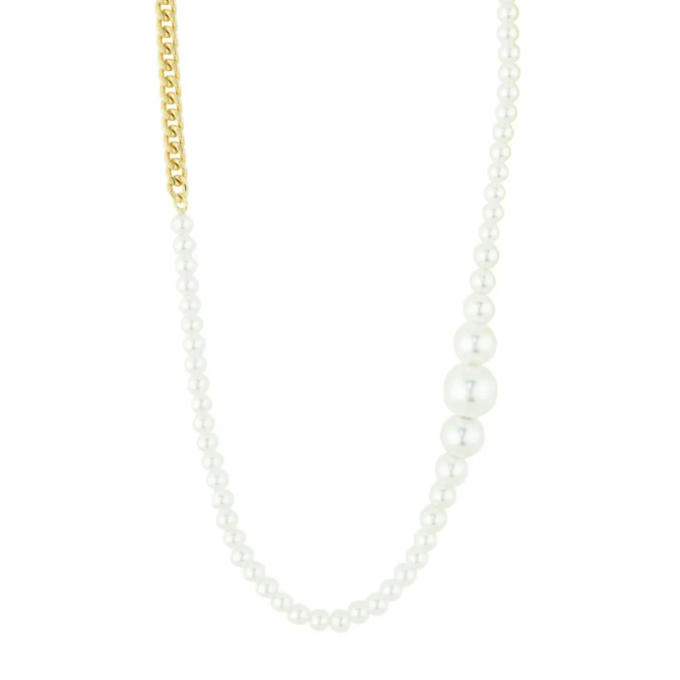 Eternally elegant! Den guldbelagte RELANDO-perlekæde fra Pilgrims Classic-Kollektion er et elegant centerpiece i et classic design. Hvide perler i varierende størrelser, giver et let og romantisk feel, kombineret med en chunky curb-chain der tilføjer kant og urban edge. Et key item i en super stylish kombi, der er et must-have denne sæson. Kæden måler 38 cm + 12 cm forlængerkæde.