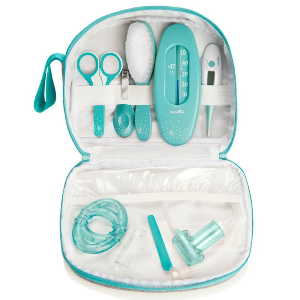 Sættet indeholder 9 forskellige dele, som kommer i en lille ultra smart taske med indre og ydre lommer i forskellige størrelser. Tasken har et stort håndtag, der gør den nem at bære og hænge op, hvorend man er.