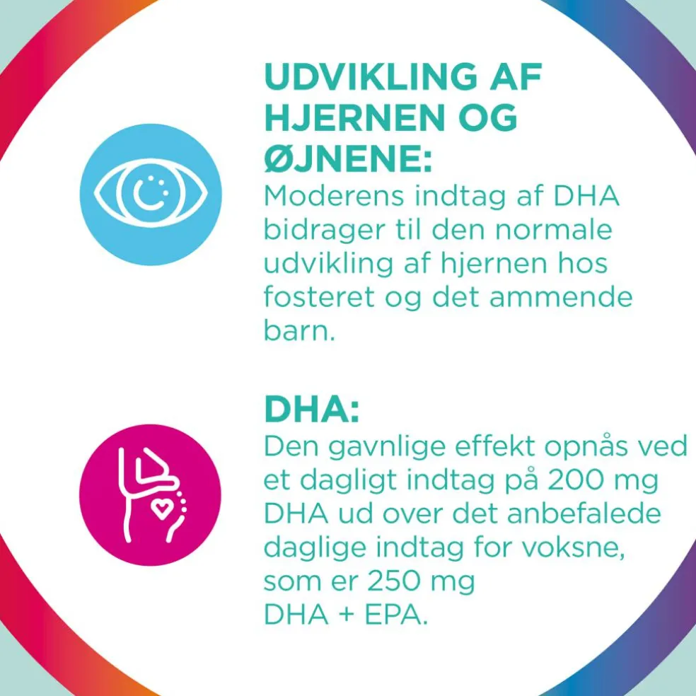 *Den gavnlige effekt opnås ved et dagligt indtag på 200 mg DHA ud over det anbefalede daglige indtag for voksne, som er 250 mg DHA + EPA.