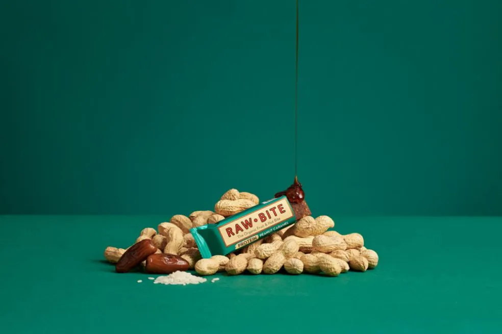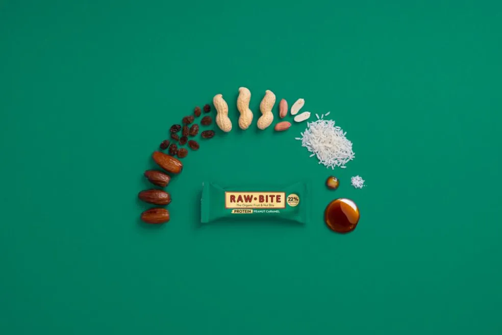 RAWBITE Protein Peanut Caramel – en økologisk proteinbar baseret på risprotein og jordnødder med en fyldig karamelsmag. Perfekt til dem, der leder efter et naturligt og velsmagende proteintilskud.