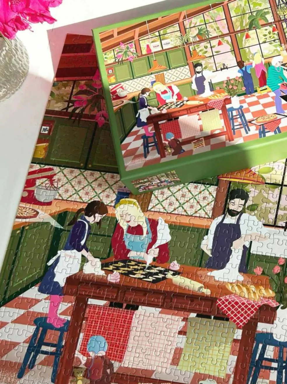 Barnet, der leger på gulvet, finder du også på puslespillet ”Christmas market” på skuldrene af sin far.