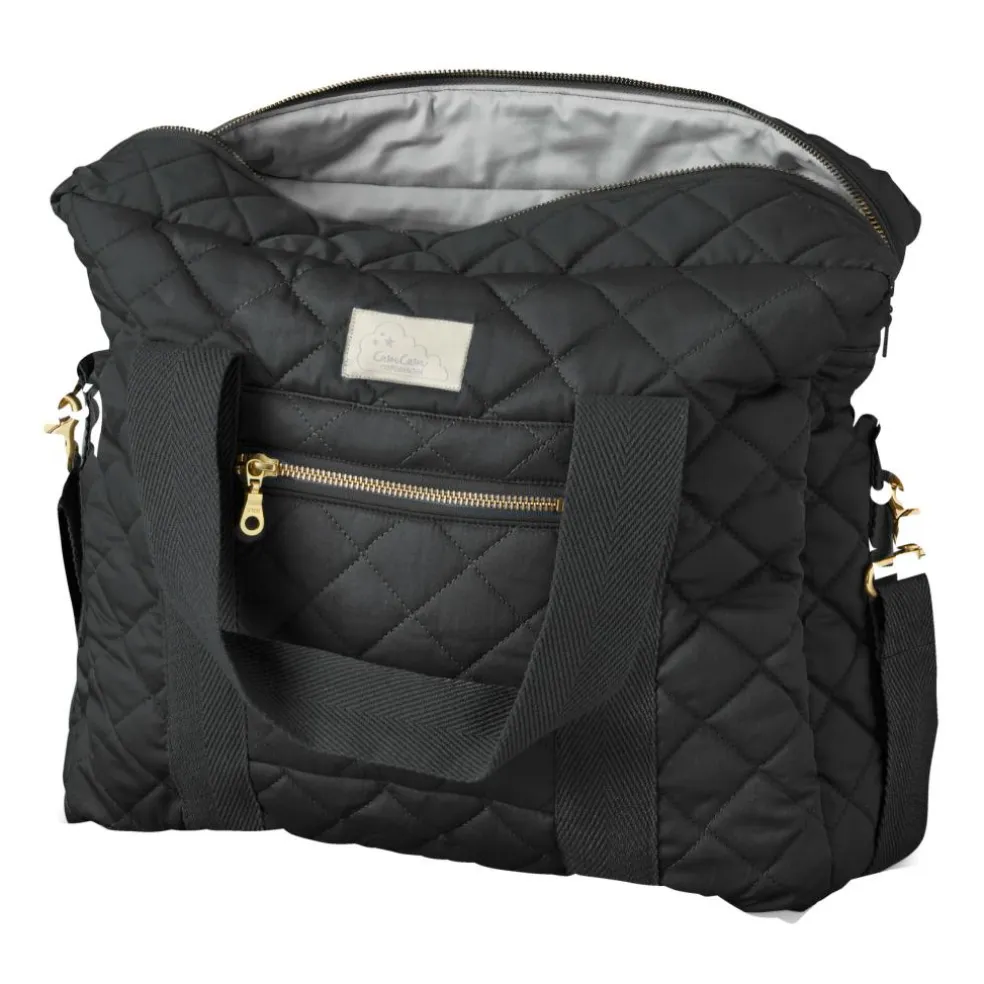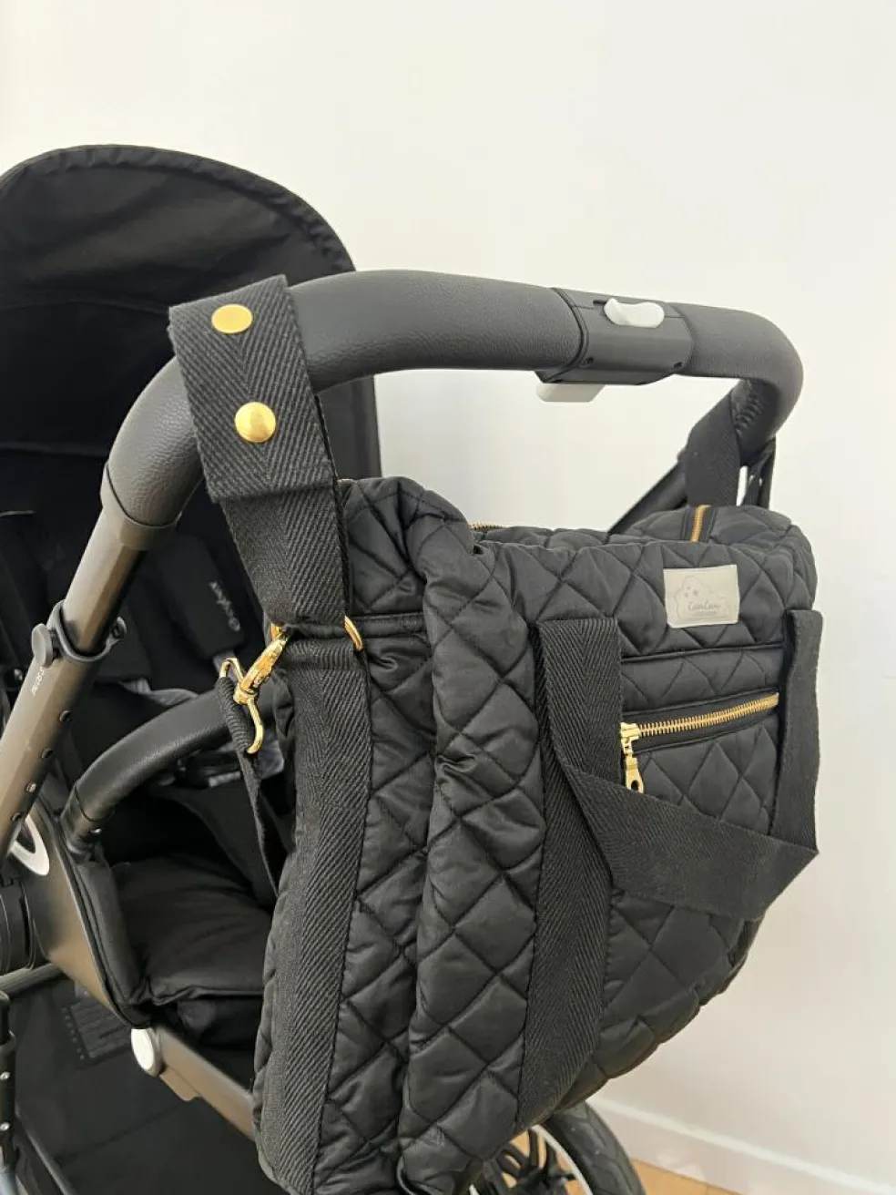 Tasken er i 100% økologisk bomuldstwill med kraftige skulderremme og en længere justerbar rem, som gør den ideel til at hænge på barnevognen.