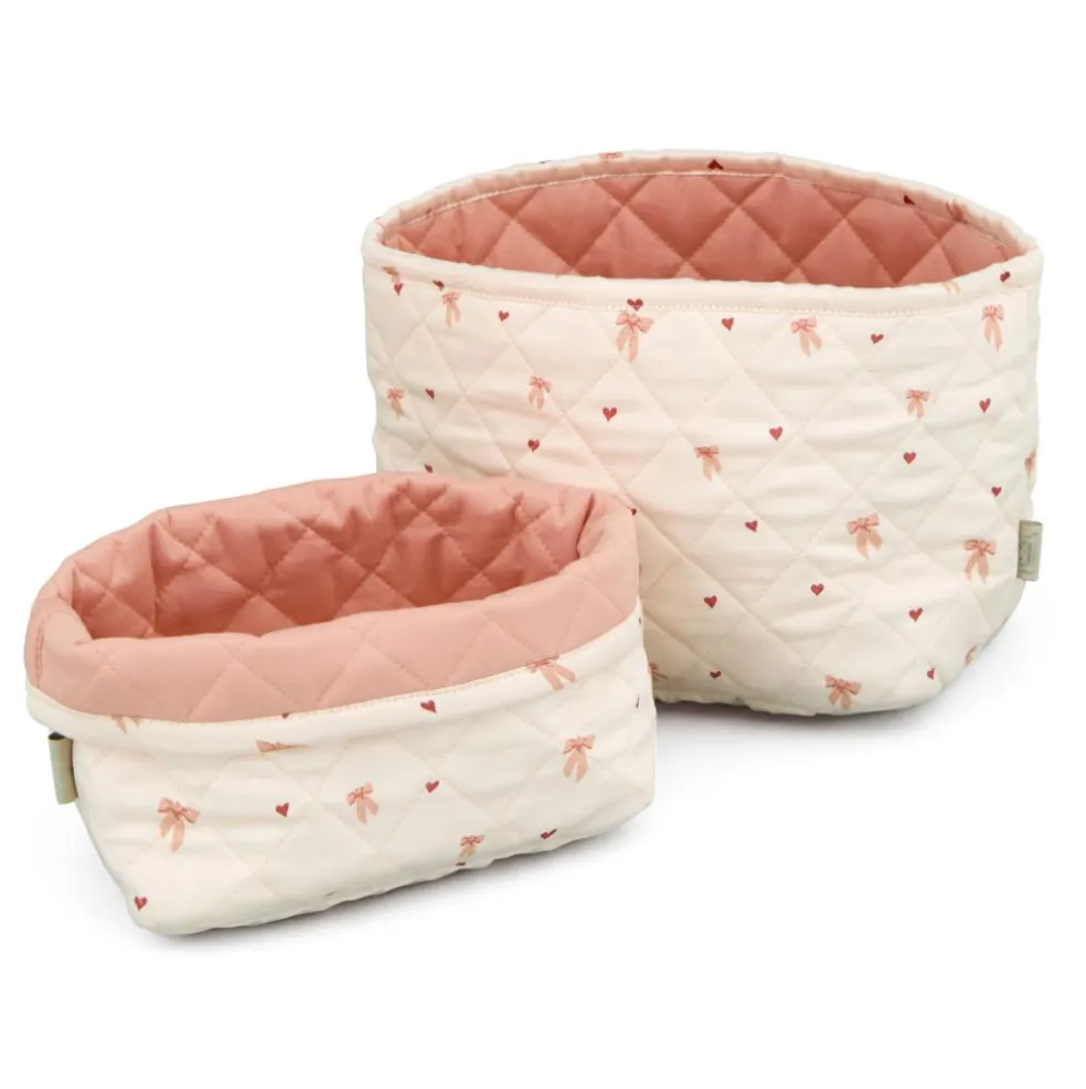 De quiltede opbevaringskurve er praktiske til organisering på puslebordet, i børneværelset eller på badeværelset. Opbevaringskurvene er lavet af OCS certificeret økologisk bomuld og har en smuk quiltning. Den indvendige linning er printet i Cam Cam signatur print, som giver dem et sødt udtryk. Kanten kan foldes ned, for at fremhæve printet.