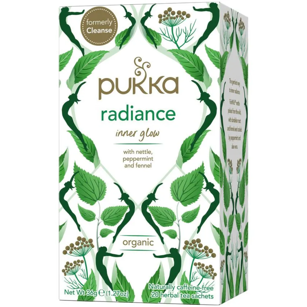 Radiance te er sprængfyldt med naturens mangfoldige grønne urter. Denne velsmagende urteteblanding er velegnet til at drikke hele dagen. Brændenælde og mælkebøtte er legendariske urter. Fennikelfrø giver en fin, sødlig smag. Alt sammen rundet af med den kølende og friske smag fra pebermynte og aloe vera.