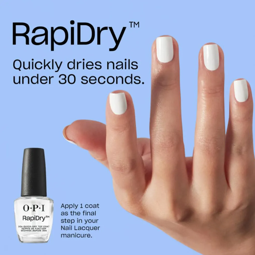 “Rapidry Top Coat” er en hurtigtørrende top coat, så neglelakken tørre hurtigere, samtidig med at lakkens holdbarhed forlænges og neglens overflade bliver hård og skinnende. Neglene bliver berøringsklar efter blot 2 minutter, og hærdede efter ca. 5 minutter.
