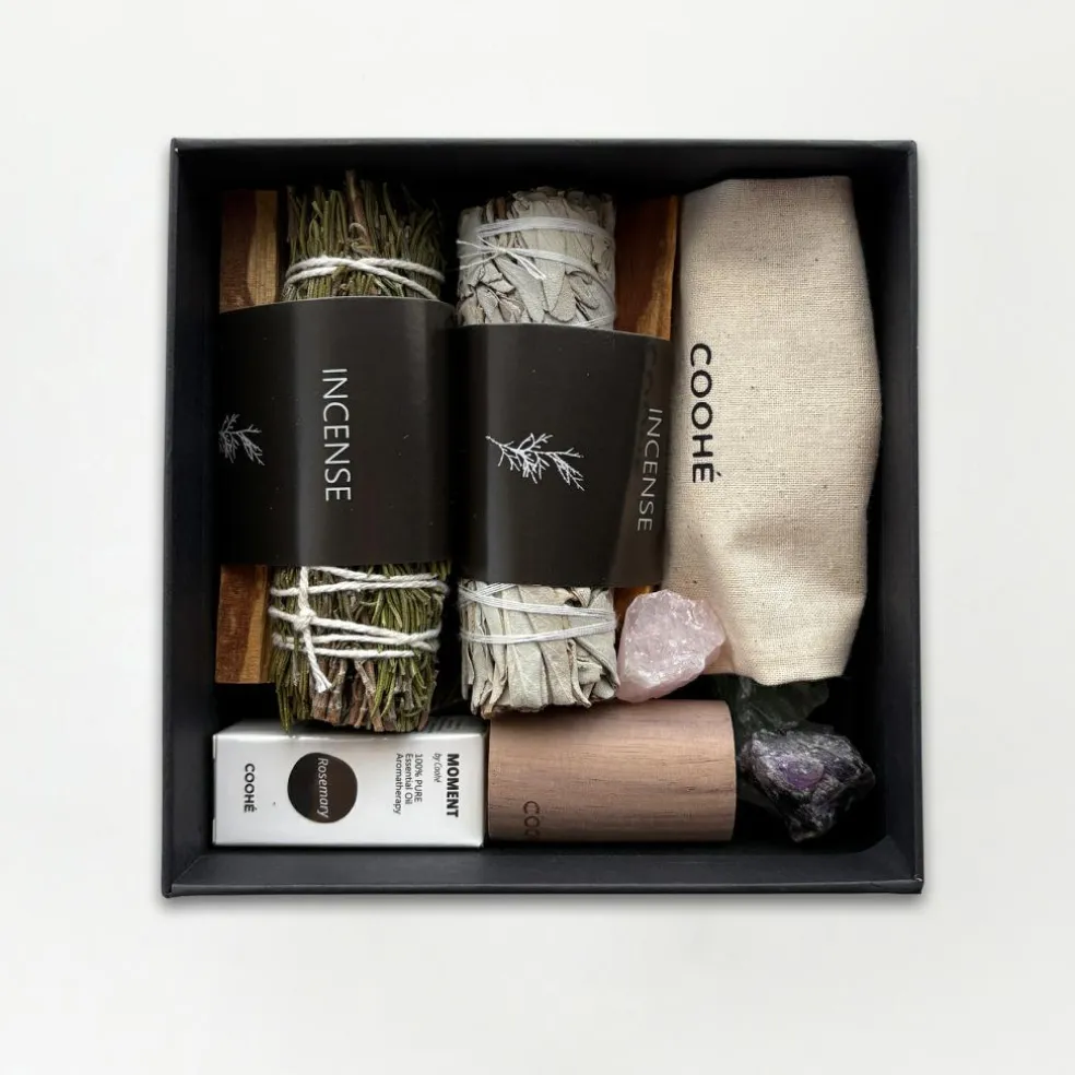 Sættet kombinerer naturlige røgelsesbundler, æterisk olie, krystaller og trædiffuser for at skabe et rum fyldt med nærvær, ro og intention.