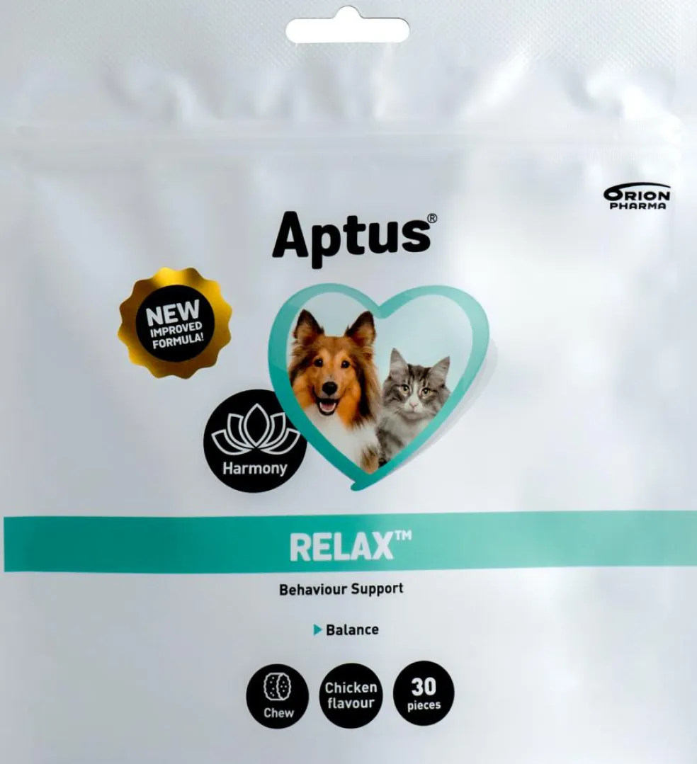 Aptus Relax kan hjælpe til roligere adfærd, hvis din hund eller kat er urolig eller utryg. Anbefales til for eksempel dyrlægebesøg, rejser, separation fra ejer, negleklipning, torden/fyrværkeri.