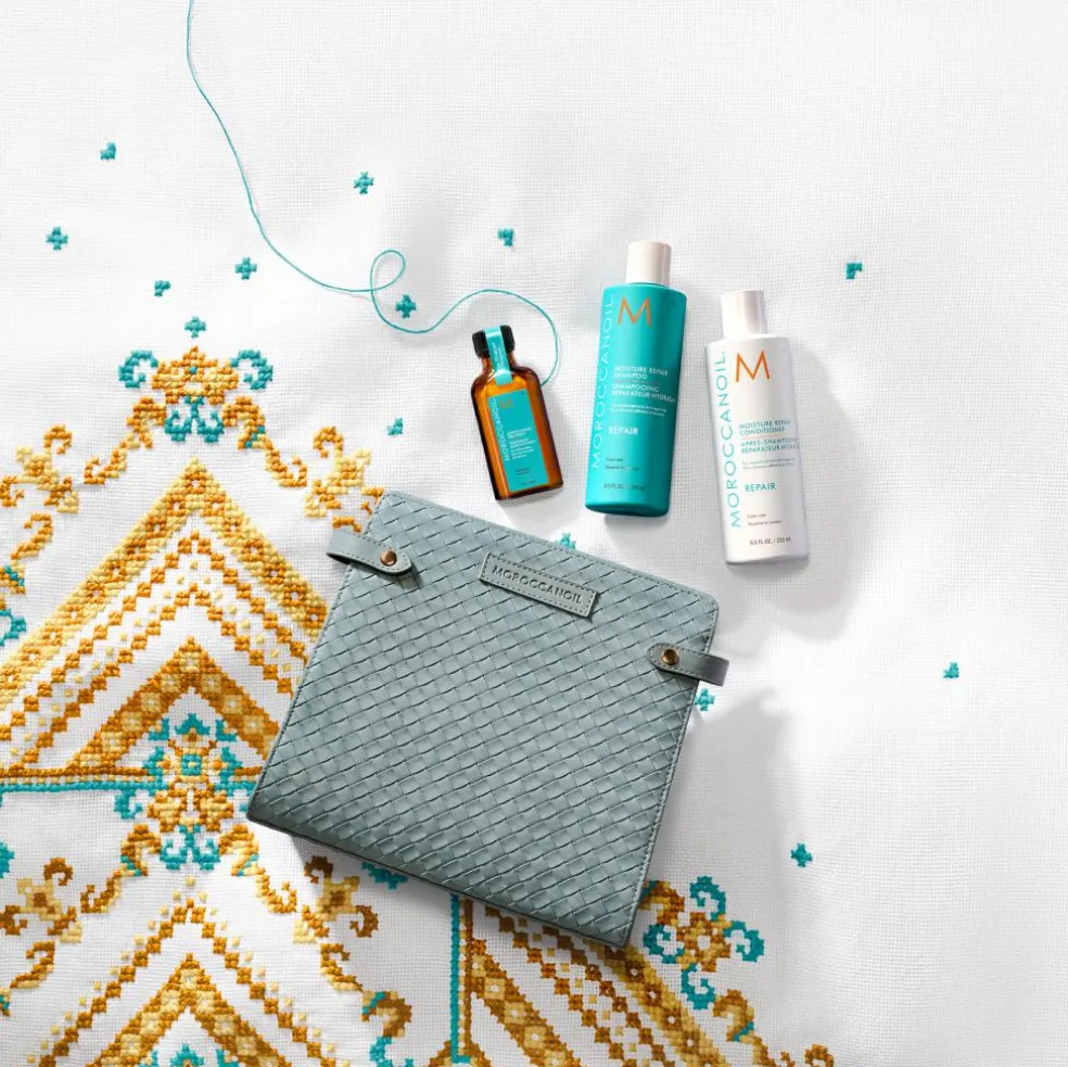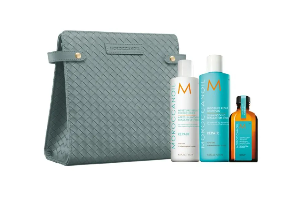 Toilettasken indeholder en Moisture Repair shampoo og Moisture Repair conditioner, som styrker håret og genopbygger dets elasticitet. En Moroccanoil Treatment, der tilfører intensiv pleje, næring og glans til håret.