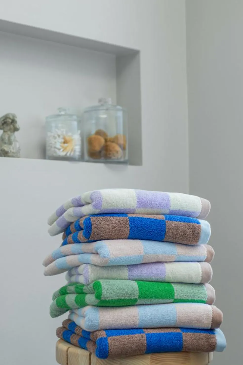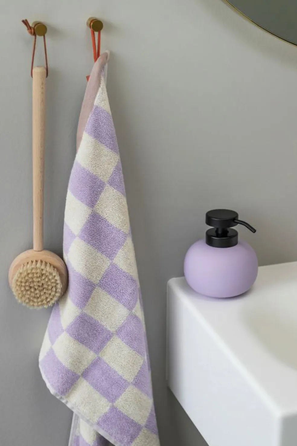 Når håndklæderne ikke er i brug, ser de fantastiske ud på et stativ eller i en åben kurv. Mix og match RETRO håndklæderne med farvestrålende badtilbehør fra Mette Ditmer.