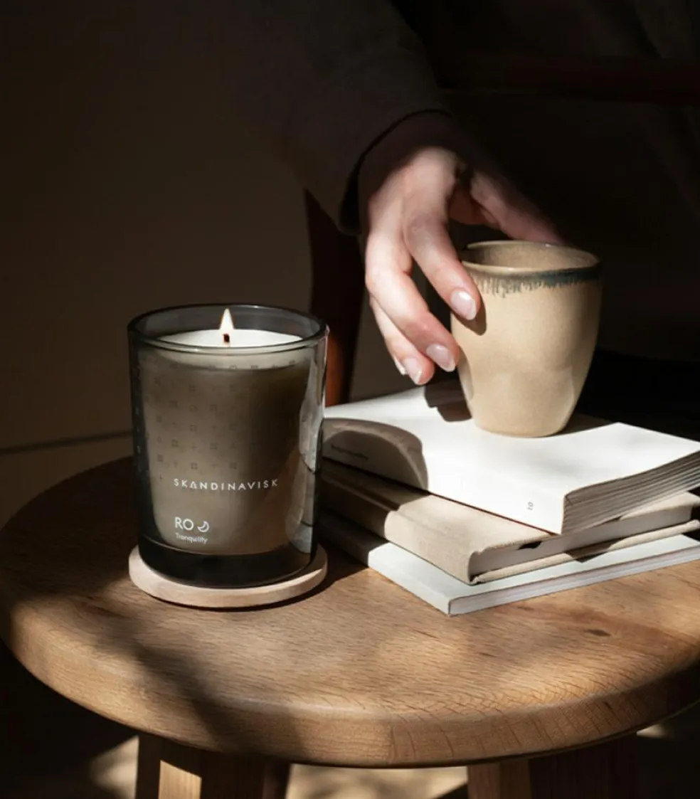 Duftlys med voks udvundet fra svensk rapsolie. Lyset er vegansk og kommer i et malet glas med indgraveret FSC-certificeret bøgetræslåg.