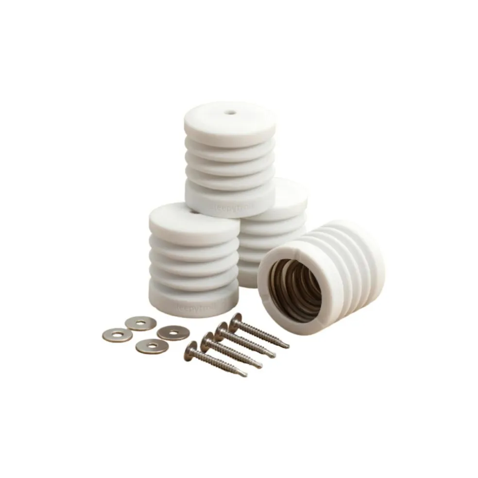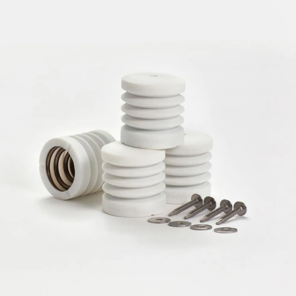 Sleepytroll Bed Rocker Fødder monteres med de medfølgende fire skruer og kan kun monteres på træ-tremmesenge.