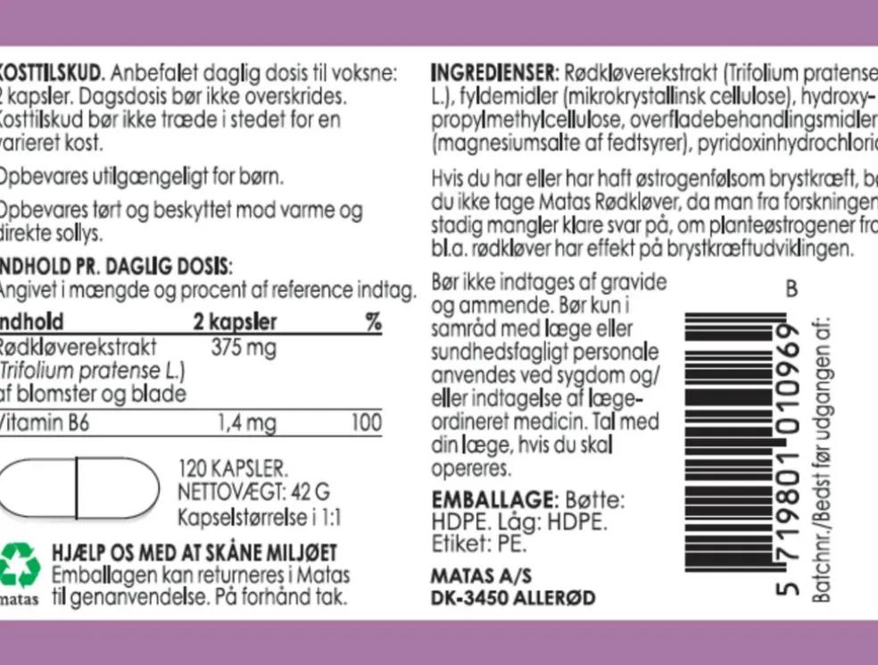 Hvis du har eller har haft østrogenfølsom brystkræft, bør du ikke tage Matas Rødkløver, da man fra forskningen stadig mangler klare svar på, om planteøstrogener fra bl.a. rødkløver har effekt på brystkræftudviklingen.
