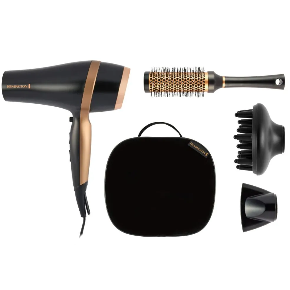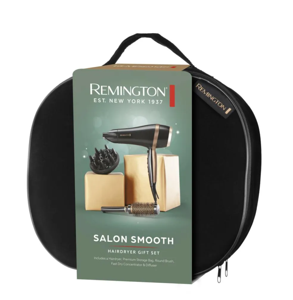 Dette luksusgavesæt og tilbehør giver dig alt, hvad du har behov for til at opnå fin salonstyling derhjemme. Med sine kraftfulde 2100W og en luftstrøm på 100km/t er tørring og styling hurtigt og nemt. Du kan bruge den hurtige tørrekoncentrator til at udglatte håret eller anvende diffuseren, der bringer naturlige krøller og bølger i spil. Sættet indeholder en børste til styling og en lækker opbevaringstaske til at beskytte dine nye stylingværktøjer, hvilket gør sættet til den perfekte gave, du kan forkæle dig selv eller andre med.Produktegenskaber: Gavesæt indeholdende premium opbevaringstaske, rundbørste, koncentrator, diffuser og hårtørrer 2100W DC hårtører med en luftstrømning på 100 km/t Keramisk belagt gitter med ionisering 3 varmeindstillinger/2 hastigheder Koldluftsfunktion Aftageligt gitter for nem rengøring Krog til ophæng 1,8 m lang ledning 2 + 1 års garanti ved registrering på remington.dk