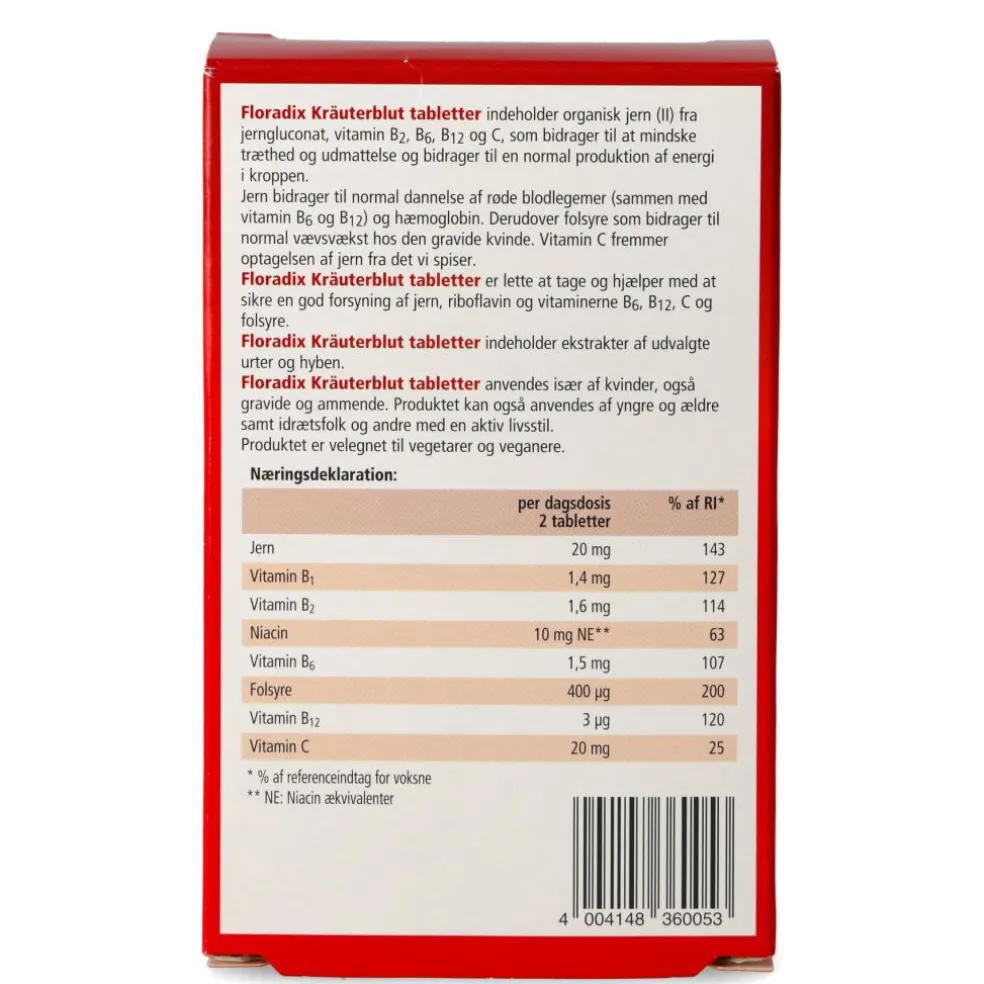 Floradix Kräuterblut indeholder organisk jern (jern II fra jernglukonat), riboflavin, vitamin B6, B12 og C.