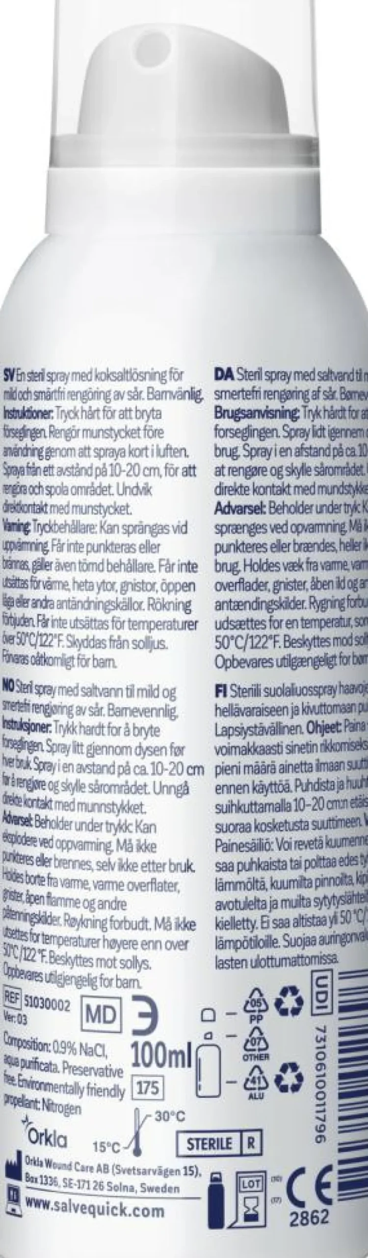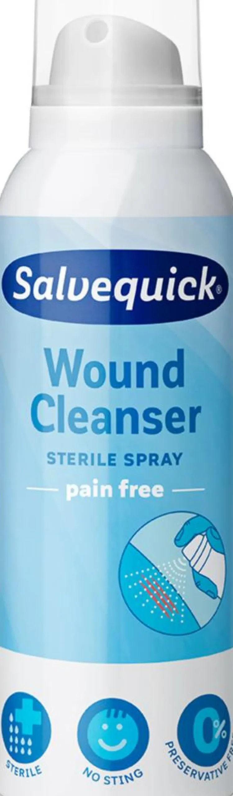 Salvequick sårrens er en steril spray med saltvand til mild og smertefri rengøring af sår.