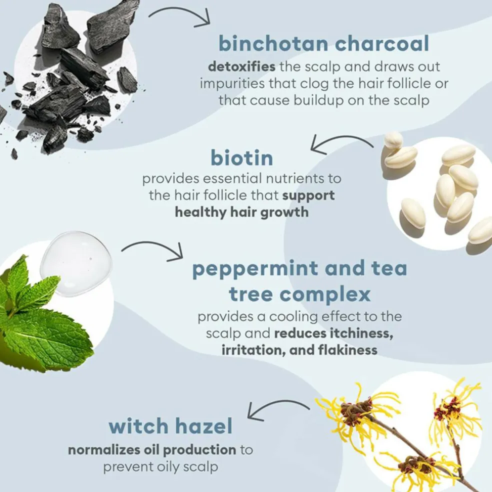 Rensende Binchotan-kul og troldnød hjælper med at forhindre fedtet hovedbund og understøtter en sund hårvækst.