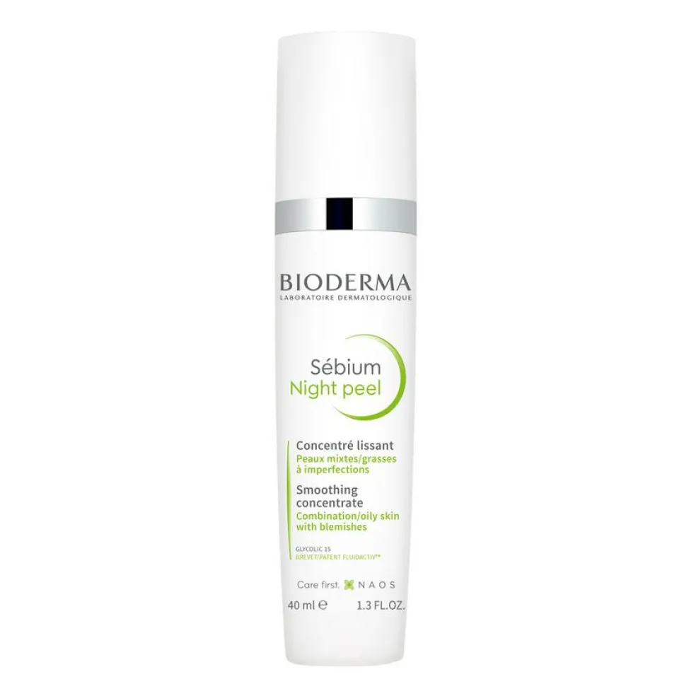 Sébium Night Peel indeholder 15% glykolsyre, en AHA-syre, som er meget anvendt af dermatologer grundet dens høje effektivitet og tolerance. Dens keratolytiske effekt på hudens overflade reducerer urenheder, mens cellefornyelsen stimuleres og hudens naturlige glød øges. Det eksklusive patenterede Fluidactiv™ kompleks regulerer talgkvaliteten og modvirker, at porerne tilstoppes, hvilket også mindsker dannelsen af urenheder. D-Panthenol har en reparerende og beroligende effekt.