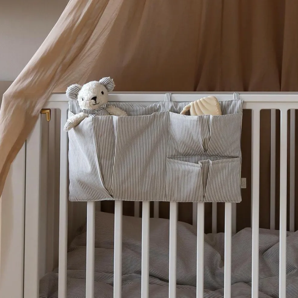 Praktisk og pæn Sengelomme til at hænge på tremmesengen, så sutter, bøger, nusseklude og andre sengetidsnødvendigheder altid er lige ved hånden.