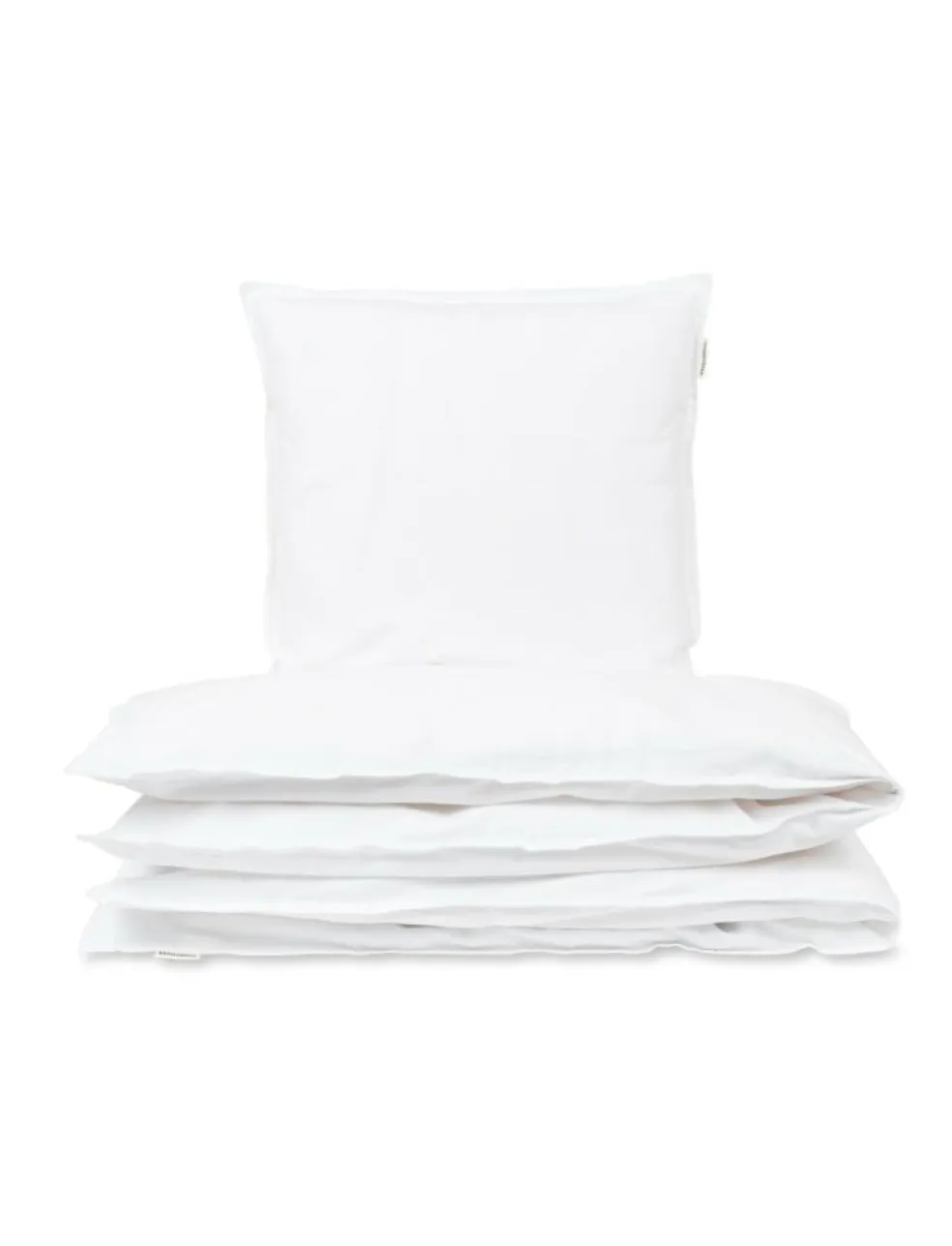 Sengetøjet leveres i en matchende stofpose, der lukkes foroven med bindebånd.