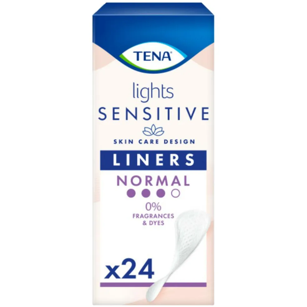 Tena Lights Sensitive Normal inkontinenstrusseindlæg til sensitiv hud. Tyndt og diskret inkontinenstrusseindlæg til små urinlækager. Hurtigt absorberende beskyttelse til sensitiv hud. Triple Protection mod lækage, lugt og fugt. Åndbare materialer, fri for parfume og farvestoffer.