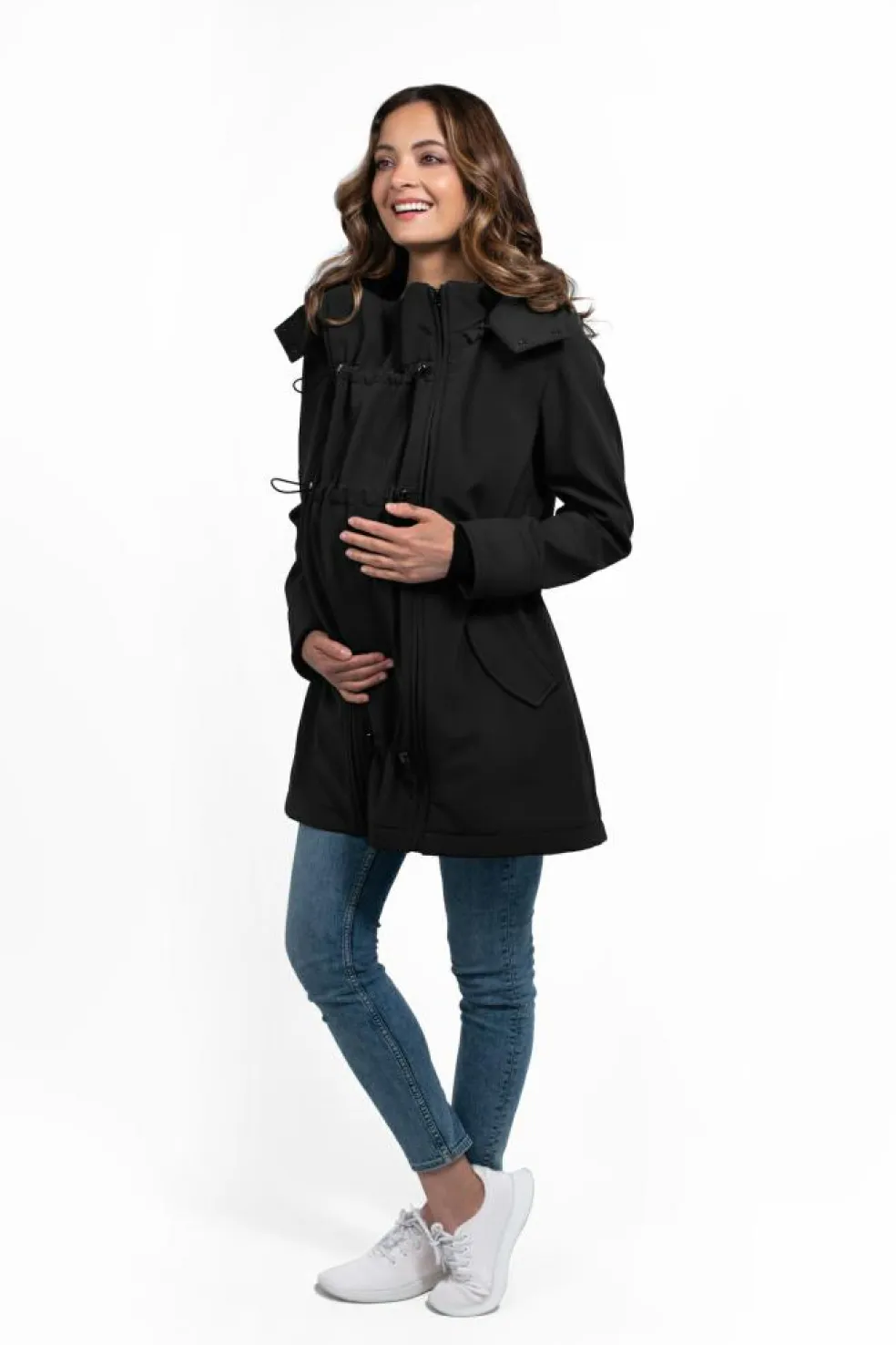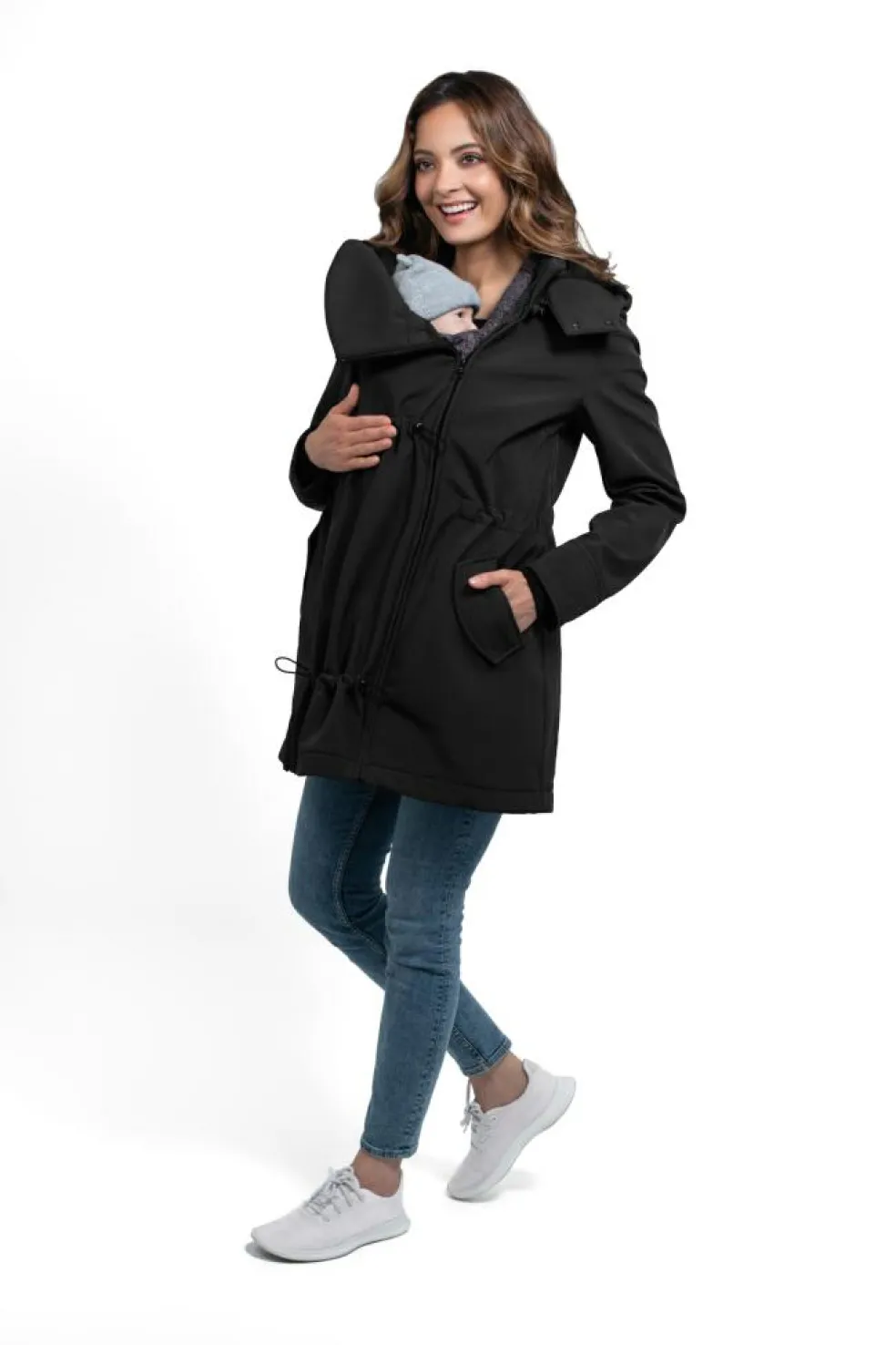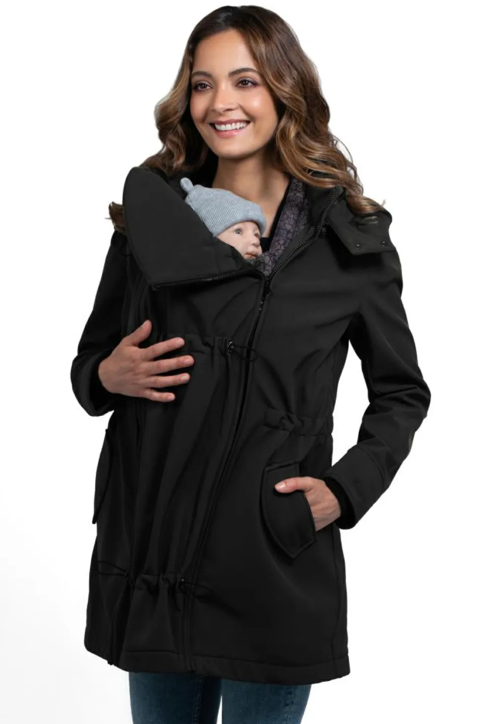 En 4-i-1 jakke, der passer over enhver bæresele eller vikle, uanset om du bærer på front eller ryg, takket være det ekstra panel. Uden panelet kan den bruges som en almindelig jakke så længe du vil.