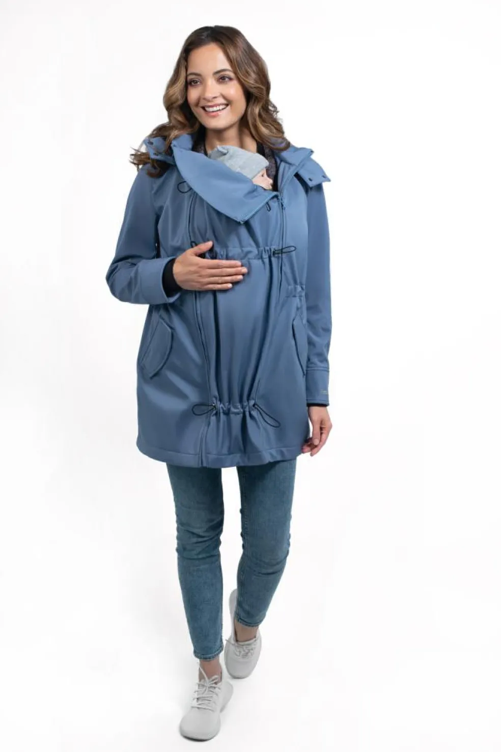 En 4-i-1 jakke, der passer over enhver bæresele eller vikle, uanset om du bærer på front eller ryg, takket være det ekstra panel. Uden panelet kan den bruges som en almindelig jakke så længe du vil.