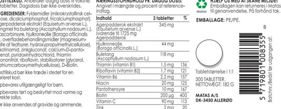 Indeholder også biotin og zink, som bidrager til at vedligeholde normalt hår og hud. Zink bidrager også til at vedligeholde normale negle.