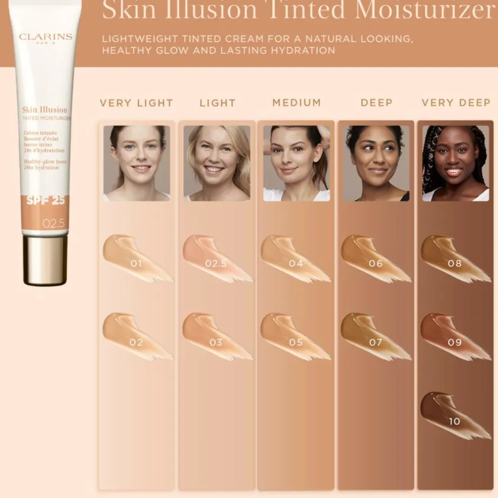 Kernen i dens ekspertformel: Mere end 80% økologiske aktive ingredienser og en 94% hudplejebase med hyaluronsyre med lav molekylvægt, som hjælper med at fugte huden. Skin Illusion Tinted Moisturizer indeholder også SPF25-beskyttelse og Clarins Anti-Pollution Complex.