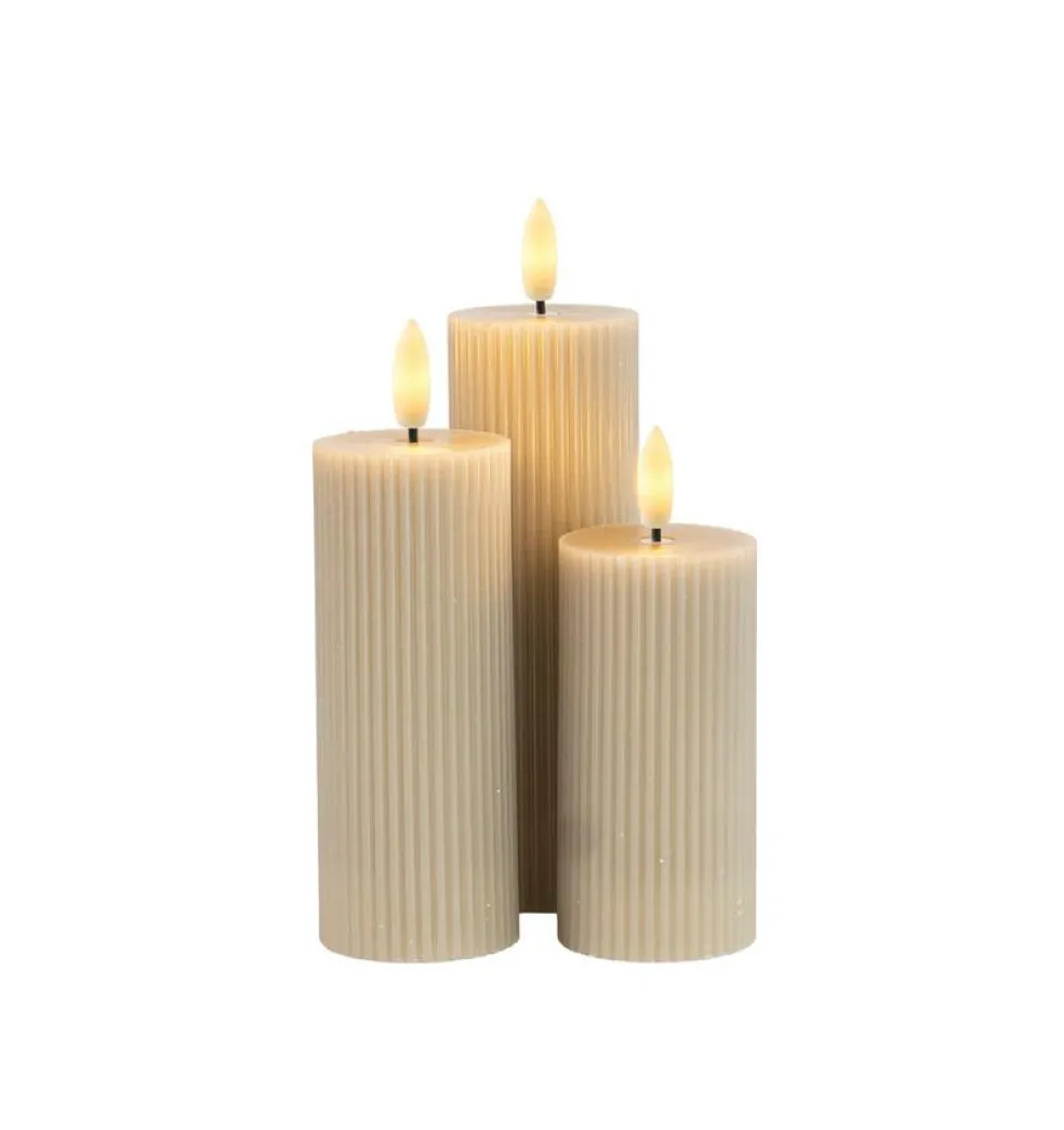 - Tre smalle bloklys med Ø5cm der måler 10, 12,5 og 15cm i højden.