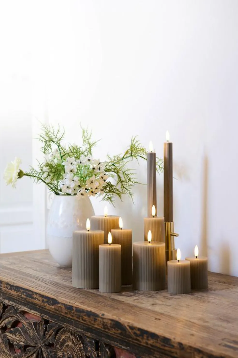 Selve lyset er lavet i stearin med en flad top, formet med en rillet overflade, som giver lyset en feminin detalje.