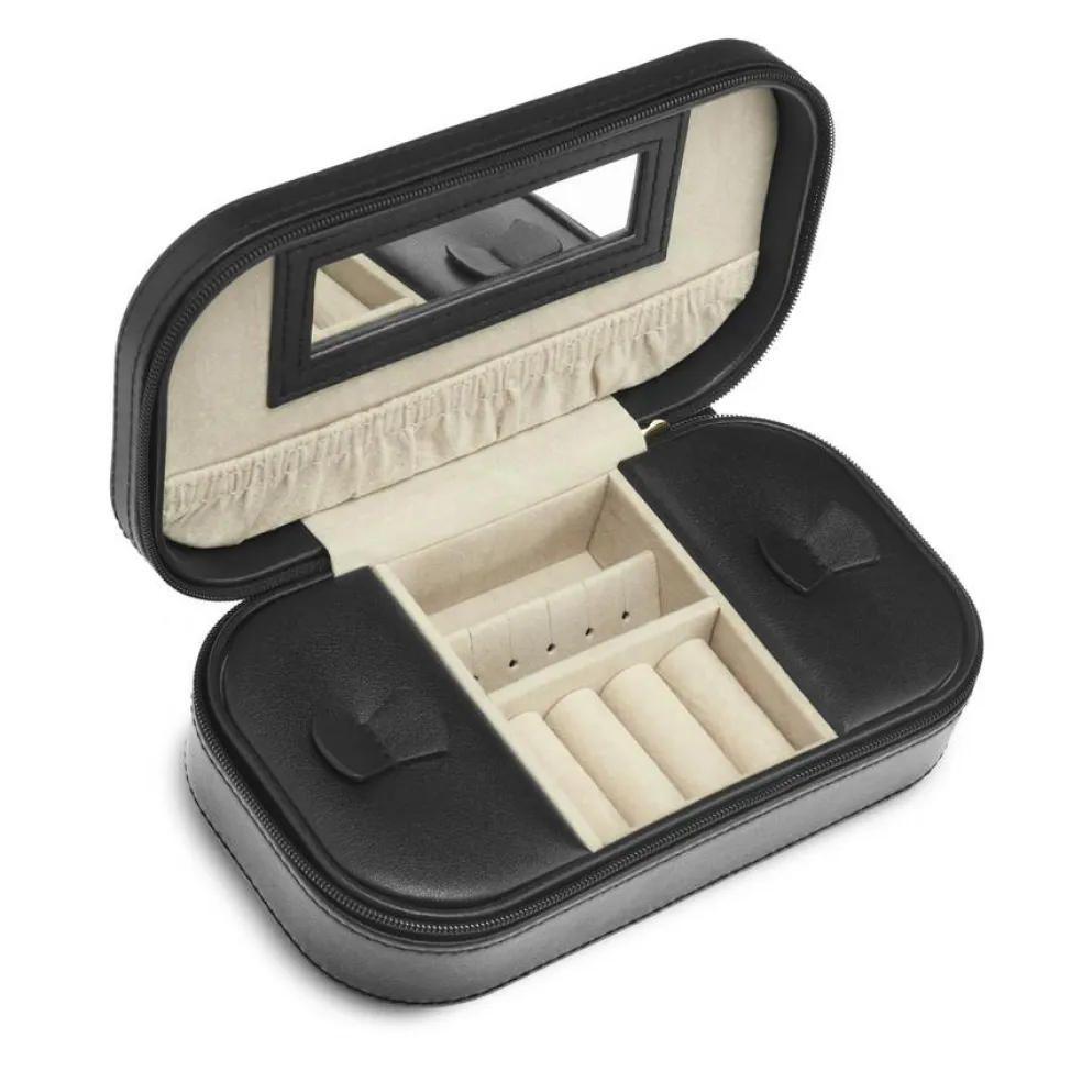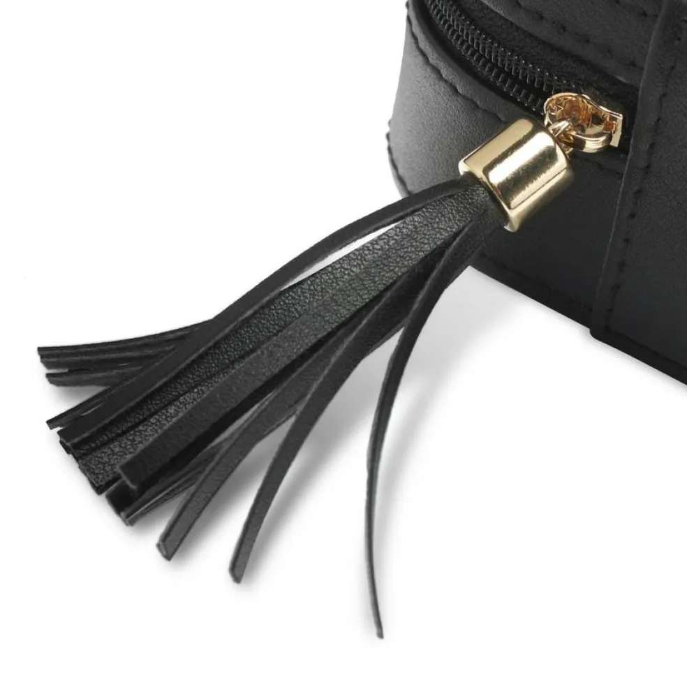 Sort smykkeskrin i vegansk PU til alle dine smykker og accessories. Smykkeskrinet har et spejl i låget, i midten rum til ørestikker og ringe, og i hver side et rum med låg til yderligere opbevaring. Smykkeskrinet lukkes med lynlås og en smart vedhængs-tassel, og har Gillian Jones logo i guld præget på toppen.