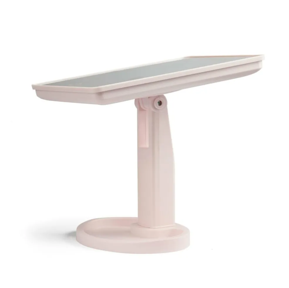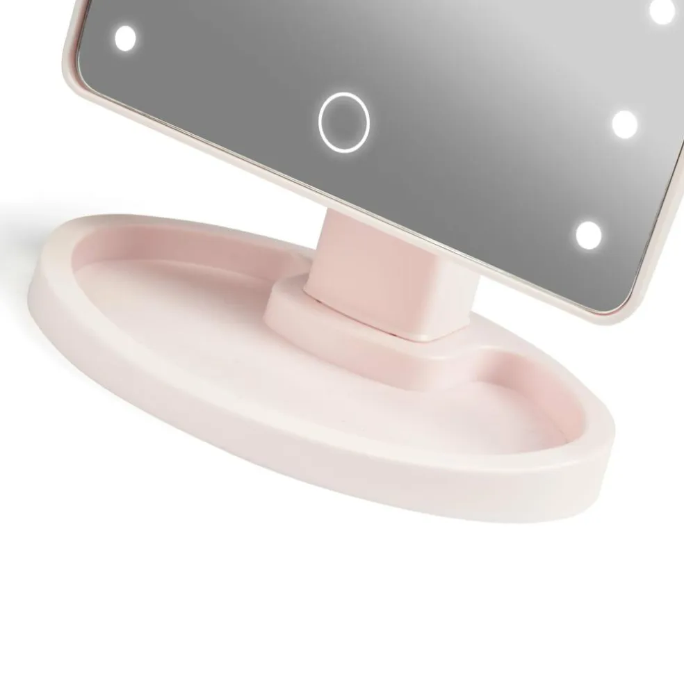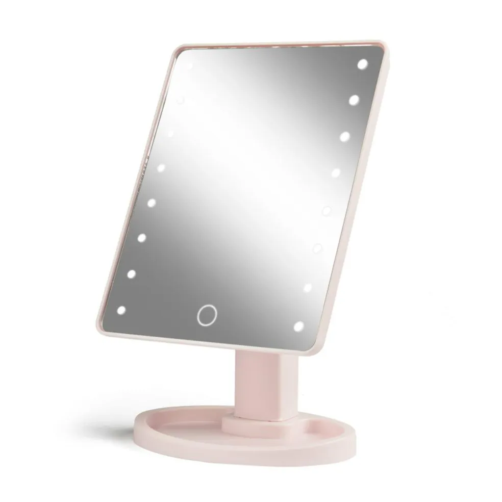 Bordspejl med 16 kraftige LED lys og touch-funktion. Spejlet kan tiltes for at få den helt rigtige vinkel når der skal lægges makeup. Med bakke-fod til bl.a. mindre genstande så som hårnåle. Bruger 4xAA batterier, og kan få strøm fra det medfølgende USB-c kabel.