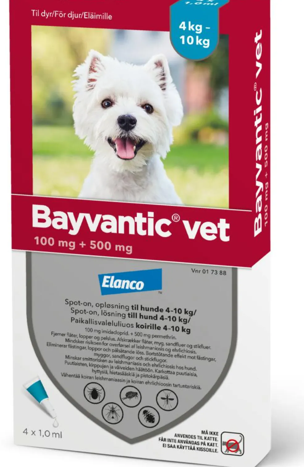 Minimum text – Enduser – Denmark Bayvantic® vet. spot-on, opløsning til hund. 1 ml indeholder 100 mg imidacloprid og 500 mg permethrin. Indikationer: Til behandling og forebyggelse af loppeangreb i 4 uger. Præparatet kan anvendes som en del af behandlings-strategien ved loppebetinget allergisk dermatit. Til behandling af pelslus. Præparatet har en vedvarende acaricid og repellerende (”antiblodsugende”) virkning mod visse flåtangreb i op til 4 uger. Reducerer sandsynligheden for ehrlichiosis fra dag 3 efter behandling og op til 4 uger. Det anbefales at fjerne flåter, inden behandling foretages. En behandling har repellerende virkning på sandfluer i op til 3 uger, på myg i op til 4 uger og på almindelige stikfluer i 4 uger. Reducerer risikoen for infektion med leishmania infantum fra sandfluer i op til 3 uger. Det er en indirekte effekt, der skyldes produktets virkning på sandfluen (vektoren).Kontraindikationer: Må ikke anvendes til katte. Hvalpe under 7 uger og 1,5 kg bør ikke behandles. Bør ikke anvendes i tilfælde af overfølsomhed over for de aktive stoffer eller et eller flere af hjælpestofferne. Advarsler og forsigtighedsregler: Må ikke anvendes til katte, da det er særdeles giftigt for dem. Katte må ikke slikke på den behandlede hunds påføringssted. Søg straks dyrlæge. Tillad ikke nyligt behandlede hunde at slikke på hinanden. Undgå at pipettens indhold kommer i kontakt med øjne eller mund på hunden. Hunde der behandles for at reducere risikoen for infektion med Leishmania infantum via sandfluer, bør holdes i et beskyttet miljø de første 24 timer efter første dosis er påført. Rådfør med dyrlægen før syge og svækkede hunde behandles. Behandlede dyr bør omgås med forsigtighed indtil påføringsstedet er tørt. Nyligt behandlede dyr bør ikke gives lov til at sove sammen med deres ejere/husets børn. Indtag ikke præparatet. Vask hænderne grundigt efter brug. Præparatet er skadeligt for organismer i vandet og behandlede dyr bør ikke komme i kontakt med overfladevand de første 48 timer. Opløsningsmidlet i Bayvantic kan forårsage pletter på visse materialer, så lad derfor væsken tørre inden kontakt. For yderligere information læs indlægssedlen.Følgende er kun gældende for produkter til hunde der vejer mere end 10 kg.Veterinærlægemidlet bør ikke administreres af gravide kvinder eller kvinder der potentielt kan være gravide. Kvinder i den fødedygtige alder bør anvende personlige værnemidler bestående af handsker ved håndtering af veterinærlægemidlet.Bivirkninger: Kløe og påvirkning af pels (f.eks. fedtet pels) på påføringsstedet samt opkastning. I sjældne tilfælde er reaktioner som rødmen, inflammation og hårtab på påføringsstedet samt diarre. I meget sjældne tilfælde er forbigående hudreaktioner (f.eks. kløe, kradsen og gniden) og sløvhed set. Disse reaktioner forsvinder normalt af sig selv. Hundene kan vise adfærdsændring, mave-tarm symptomer og neurologiske reaktioner, hvis hunden er følsom overfor permethrin. Symptomerne er normalt forbigående og kræver ingen behandling.Drægtighed og diegivning: Kan anvendes under drægtighed og laktation. Interaktioner: Ingen kendteDosering: Kun til brug på huden. Hunde > 1,5 = 4 kg: 1 pipette a 0,4 ml; > 4 kg = 10 kg: 1 pipette a 1,0 ml; > 10 kg = 25 kg: 1 pipette a 2,5 ml; > 25 kg = 40 kg: 1 pipette a 4,0 ml; >40 kg = 60 kg: 1 pipette a 6,0 ml. Til hunde > 60 kg bruges en passende kombination af pipetter. Opløsningen fordeles på huden af ryggen fra skulderbladene til haleroden. Skal hunden vaskes med shampoo gøres dette før påføring af Bayvantic eller mindst 2 uger efter. Behandles mod pelslus bør dyrlægen kontrollere effekten efter 30 dage, da en yderligere dosis kan være nødvendig. For beskyttelse i hele sæsonen for sandfluer bør behandlingen omhyggeligt fortsættes i hele perioden.Pakningsstørrelser: pakninger med 4 pipetter á: 0,4 ml (hunde op til 4 kg) – 1,0 ml (hunde på 4-10 kg) – 2,5 ml (hunde på 10-25 kg) – 4,0 ml (hunde på 25-40 kg) – 6,0 ml (hunde på 40-60 kg). LÆS INDLÆGSSEDLEN FØR BRUGSenest ændret: 04-07-2023Forhandles af: Elanco Denmark ApS, Lautrupvang 12, 2750 Ballerup. Telefon 4526 6060DKmiADX0723u