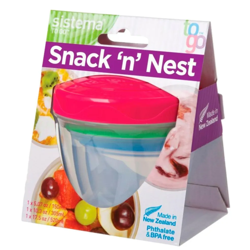 Snack’N Nest 3 Pack til at tage med på picnicturen, eller som ekstra tilbehør til madpakken. Klar plast med friske farver på låg. Tåler opvaskemaskine og fryser.