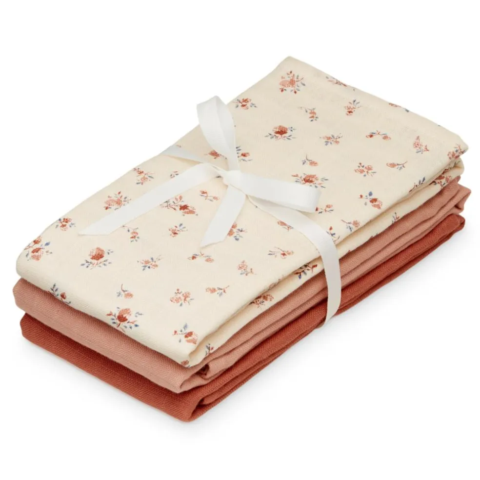 Blandet 3-pak af bløde stofbleer i 100% økologisk GOTS-certificeret Muslin bomuld. Stofbleerne er multifunktionelle, og kan bruges både ved amning, ved bleskift, som nusseklud eller som solafskærmning i barnevognen. De 3 stofbleer er pakket med en fin grå sløjfe omkring, hvilket gør det til en oplagt lille gaveidé. Muslin stoffet trækker sig lidt sammen og ændrer tekstur efter vask. 3-pak kommer i forskellige kombinationer. Stofble, 3-pak i rosa, røde og blå nuancer på en cremehvid baggrund. 100% Økologisk Bomuld – GOTS. Kategori: GOTS-certificeret ‘Organic’ – ETKO 4401