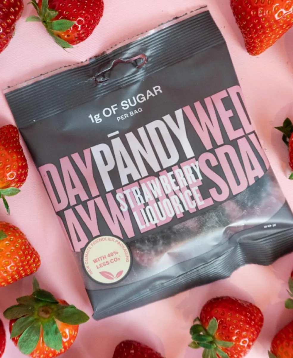 Syrlig vingummi med jordbær/lakridssmag uden tilsat sukker.